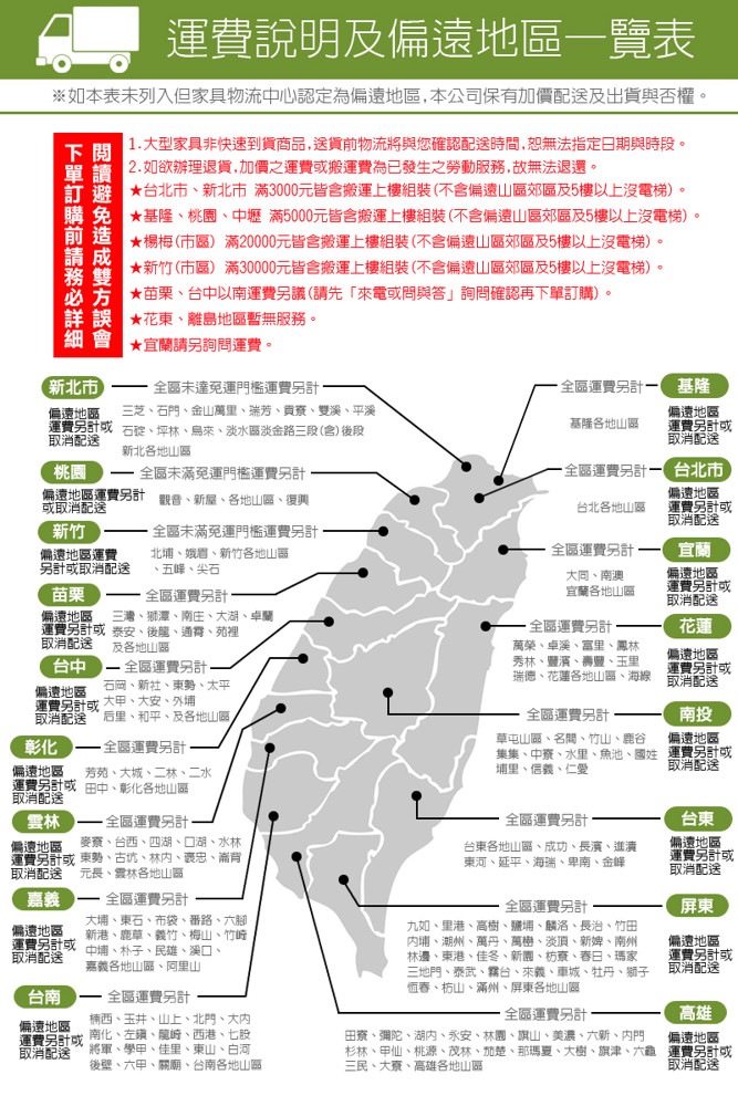 3. 商品配送日期時間若無法配合您希望到貨時段,需以本店安排車趟為主,如造成您的不便,敬請見諒。