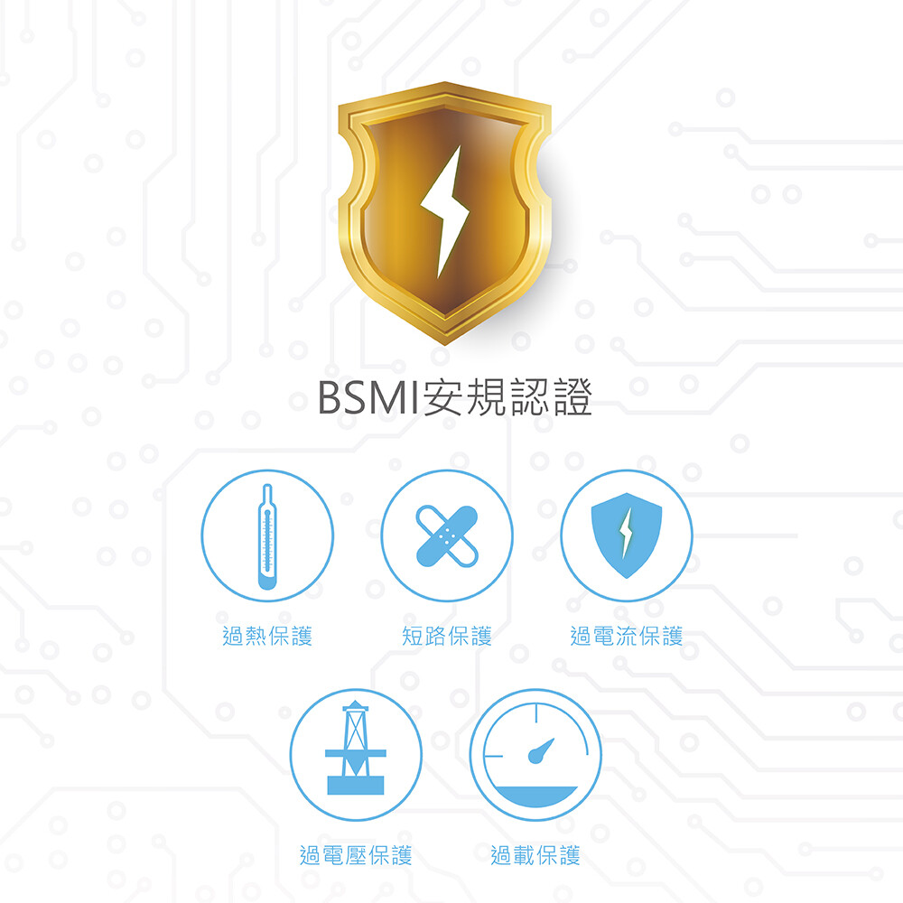 安全防火材質、通過BSMI認證,避免過充、過載、過壓、短路