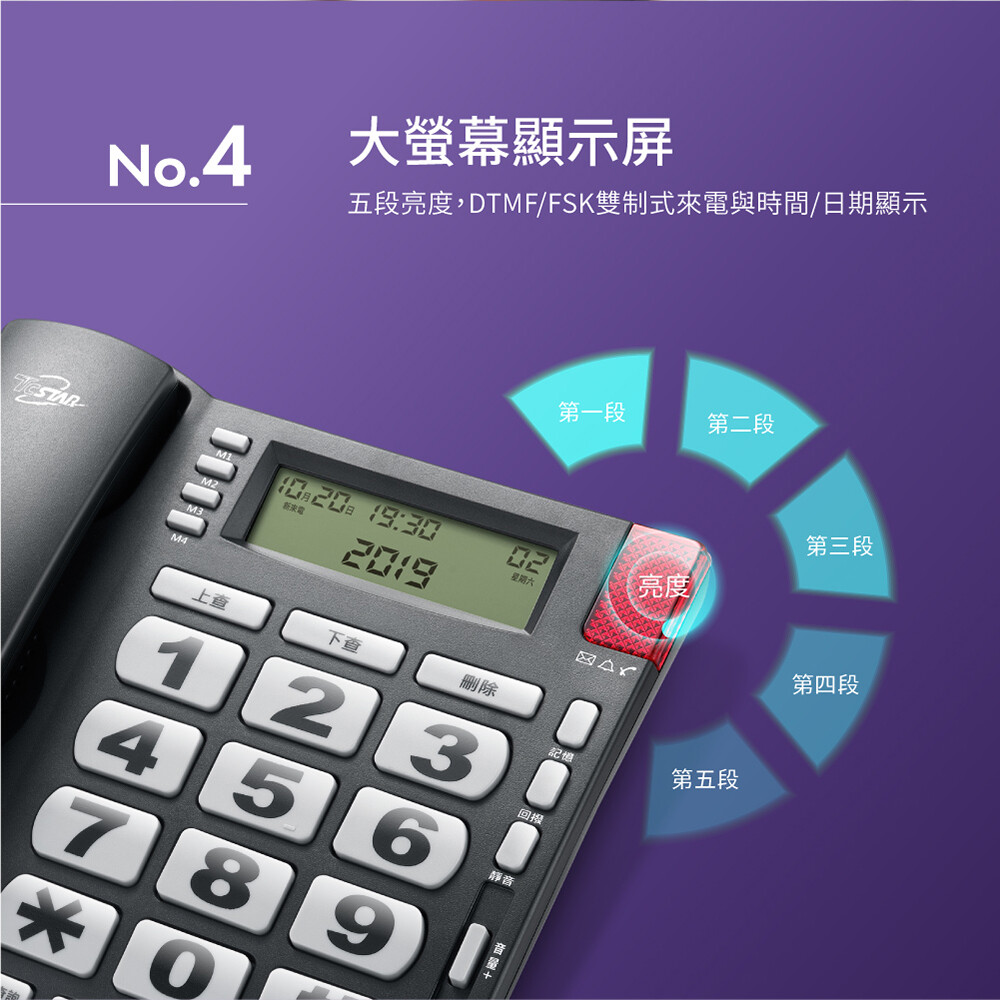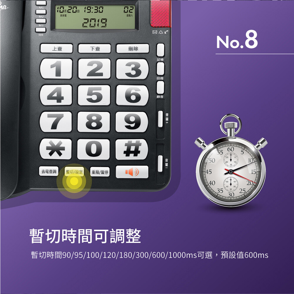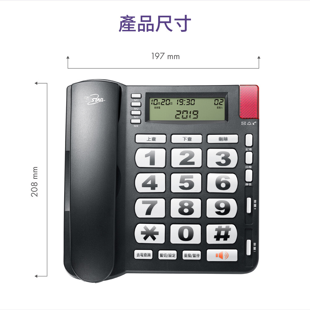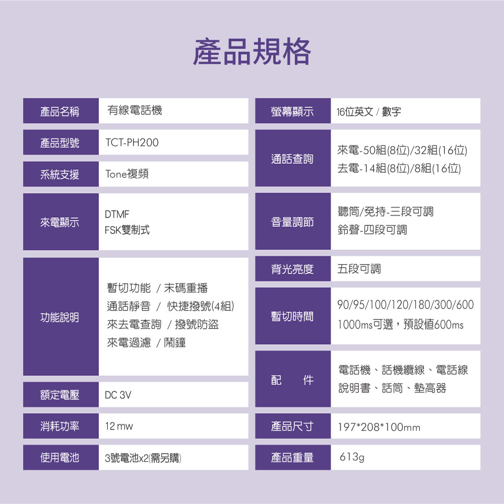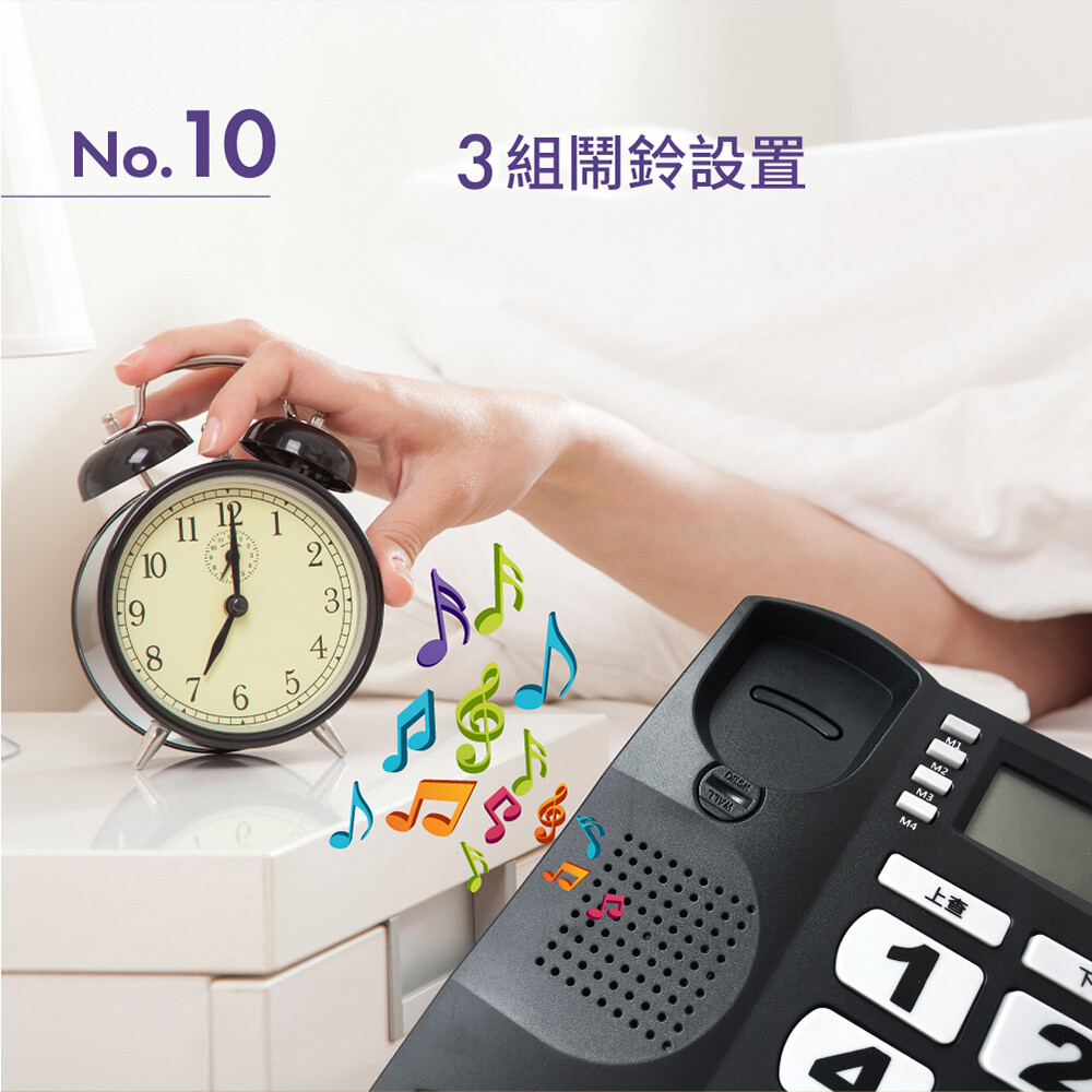 .功能說明 :暫切功能/末碼重播/通話靜音/快捷撥號x4/來去電查詢/撥號防盜/來電過濾/鬧鐘