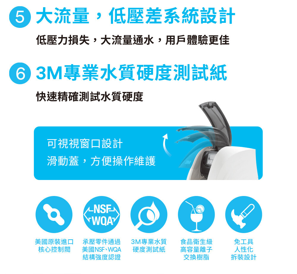 承壓零件通過NSF、WQA結構強度認證,及3M實驗室高標準測試校驗。穩定運作,居家使用更安心。