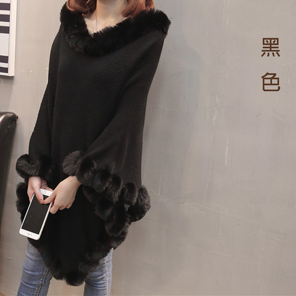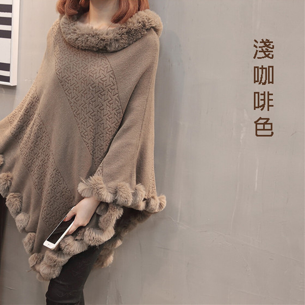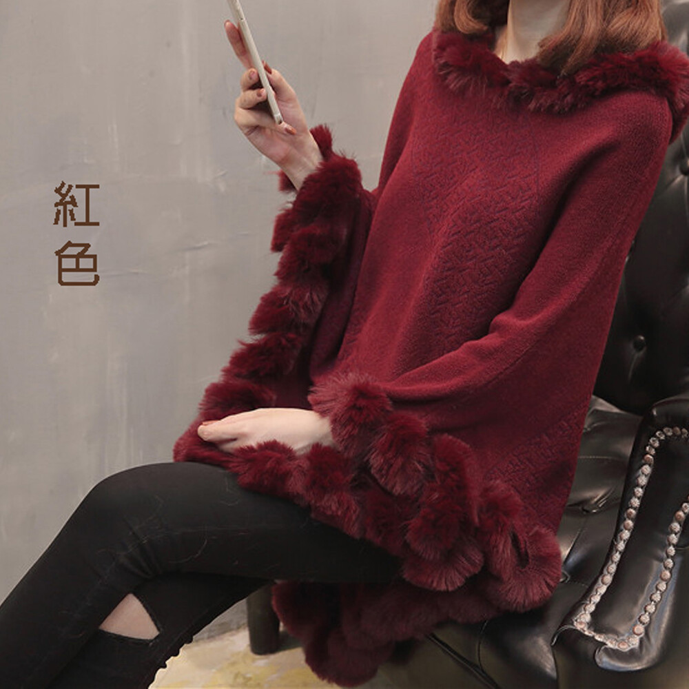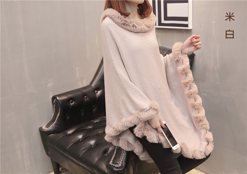 寬鬆仿狐狸毛流蘇領套頭針織斗篷披肩