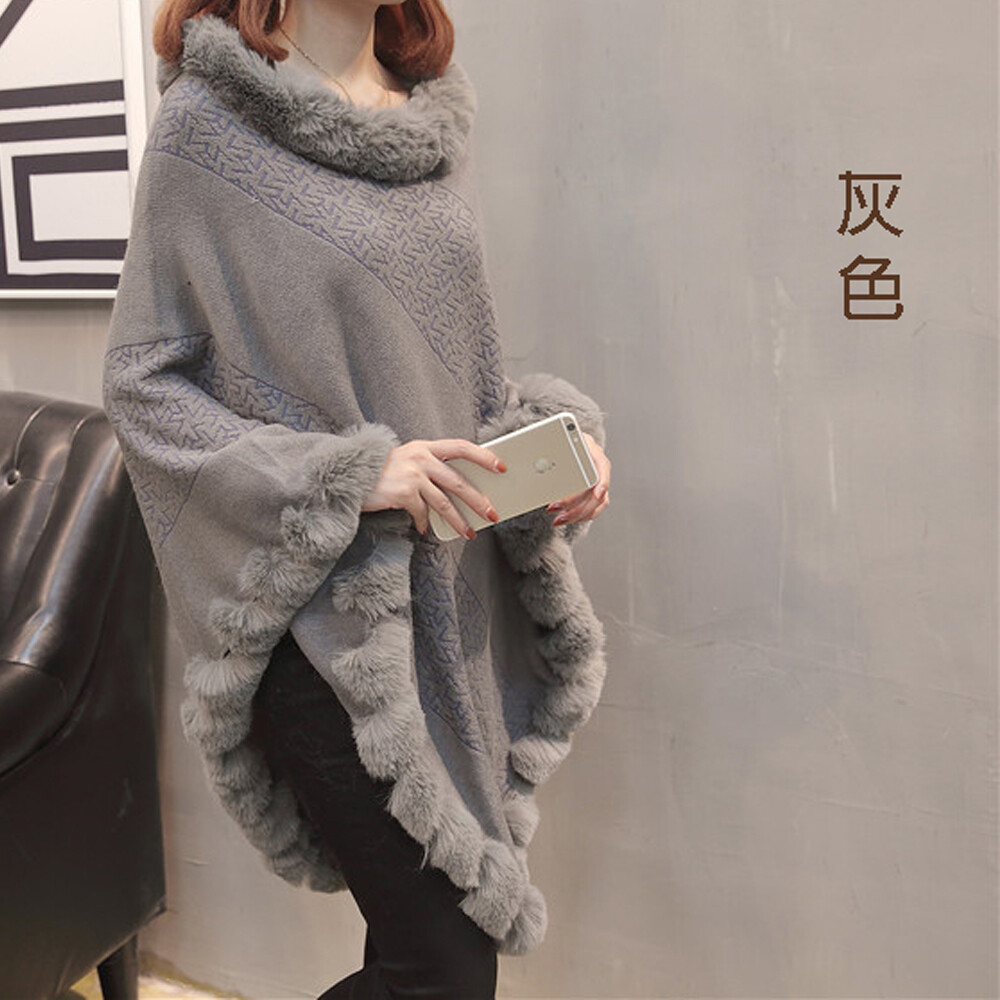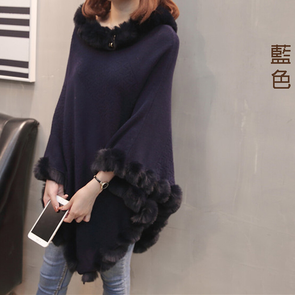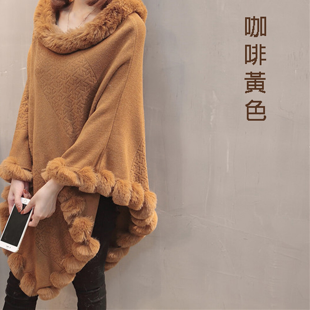 寬鬆仿狐狸毛流蘇領套頭針織斗篷披肩