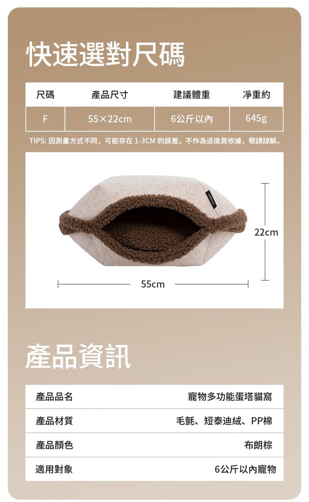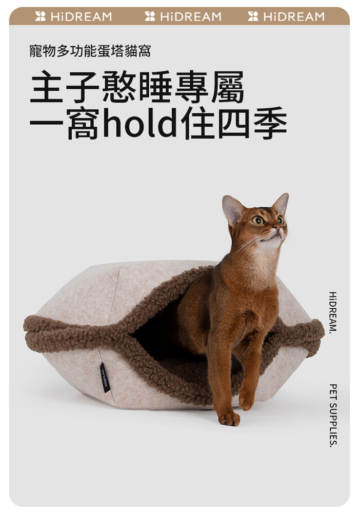 HiDREAM 寵物多功能蛋塔貓窩 商品特色 : •雙層立體支撐有型不易塌 •加厚毛毯布防抓磨 •軟墊雙面材質適用不同季節 •可拆洗設計 品名 : 寵物多功能蛋塔貓窩 商品材質 :毛氈布 適用對象:貓貓、中小型狗狗 寵物 承受重量:6kg內寵物 生產國:中國
