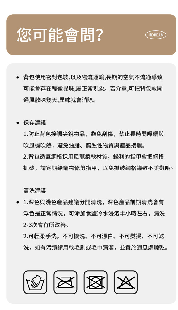 注意 : 不可機洗、不可漂白、不可熨燙、不可乾洗