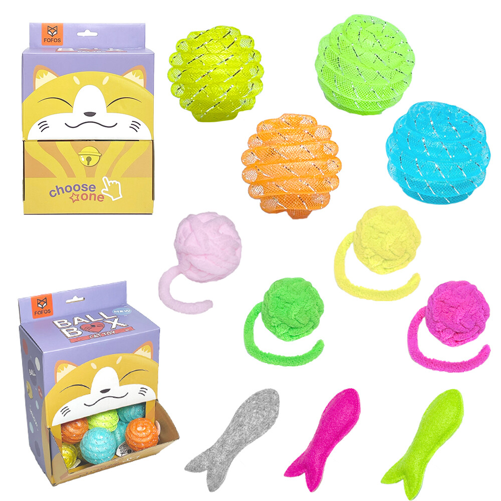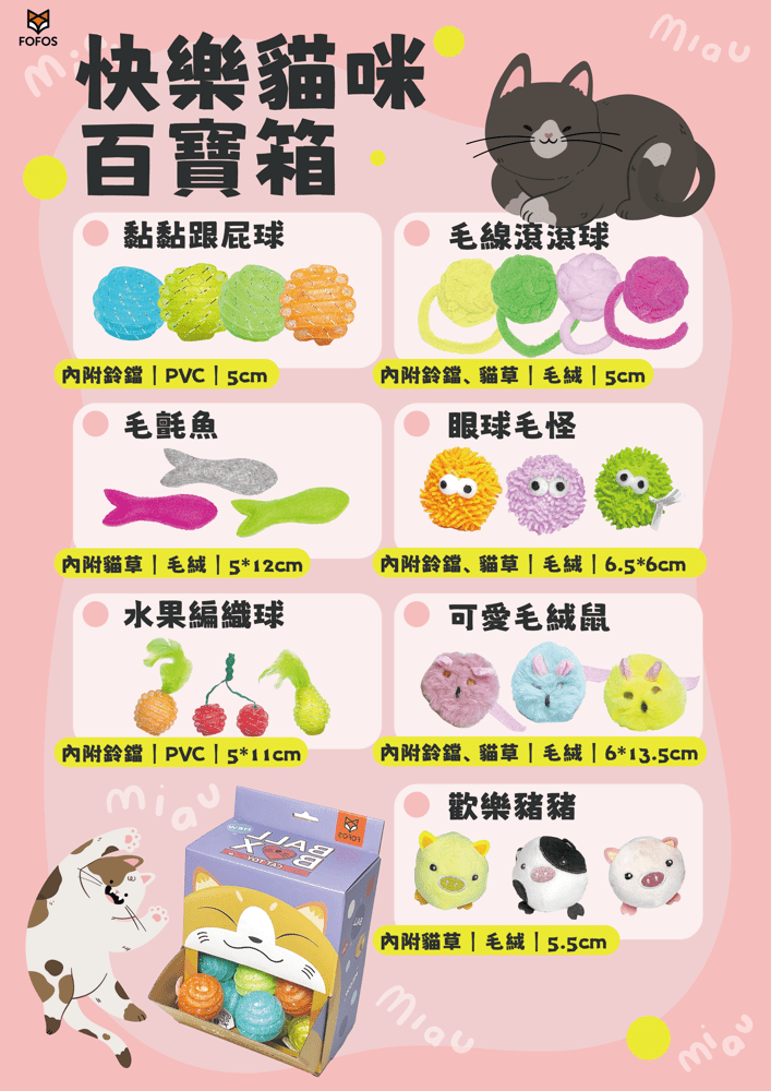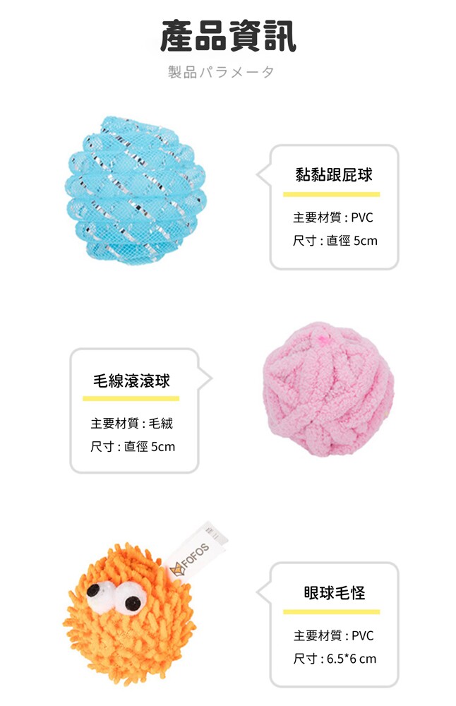 FOFOS 兩只福狸 寵物百寶箱逗貓球/魚魚 品牌:FOFOS 兩只福狸 品名 : 寵物百寶箱逗貓球/魚魚 🔹黏黏跟屁球材質 : PVC 🔹毛線滾滾球材質 : 毛絨 🔹毛氈魚材質 : 毛絨 ❗注意 : 顏色隨機出貨,單顆販售❗