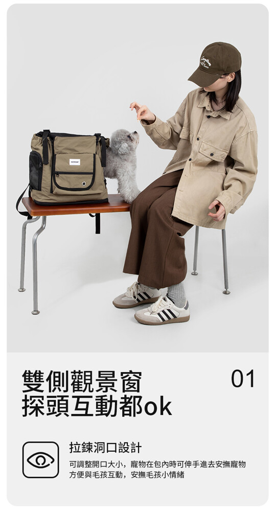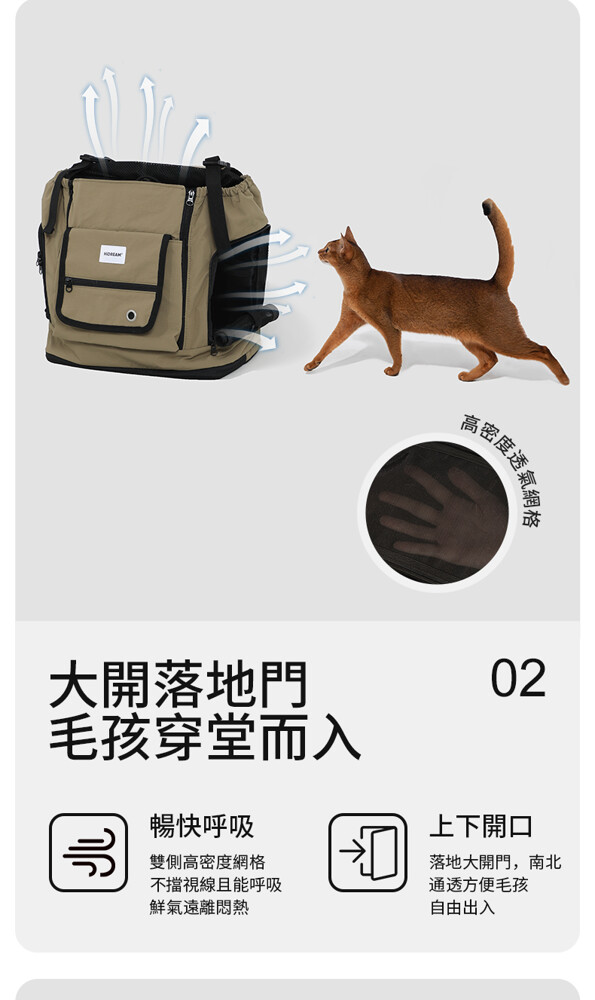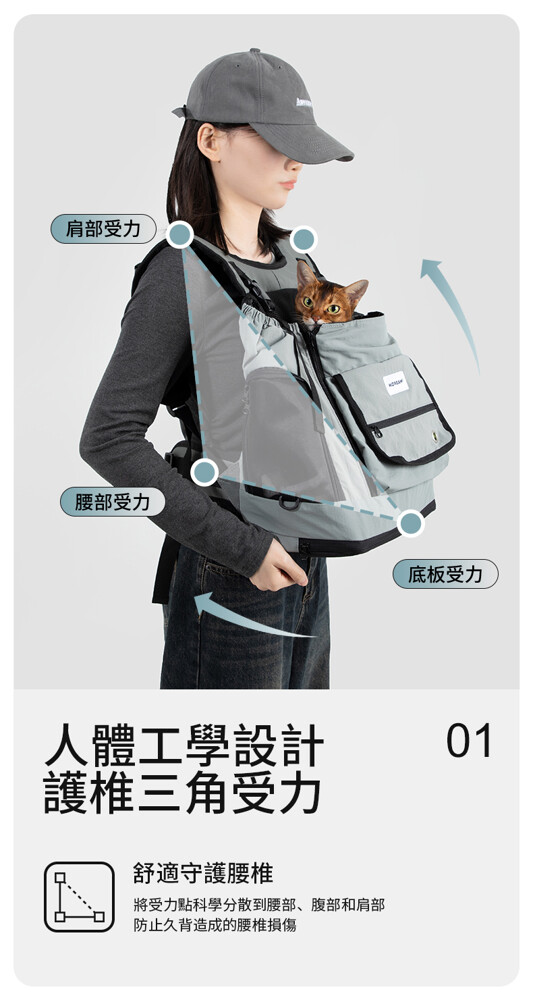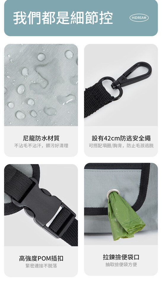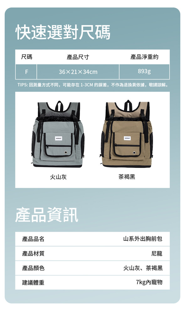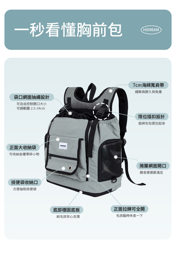 防水好清理,透氣、內有防逃扣,久背不腰痠,頂部抽繩開口,穩固底板不塌不變形,正面拉下可趴休息。