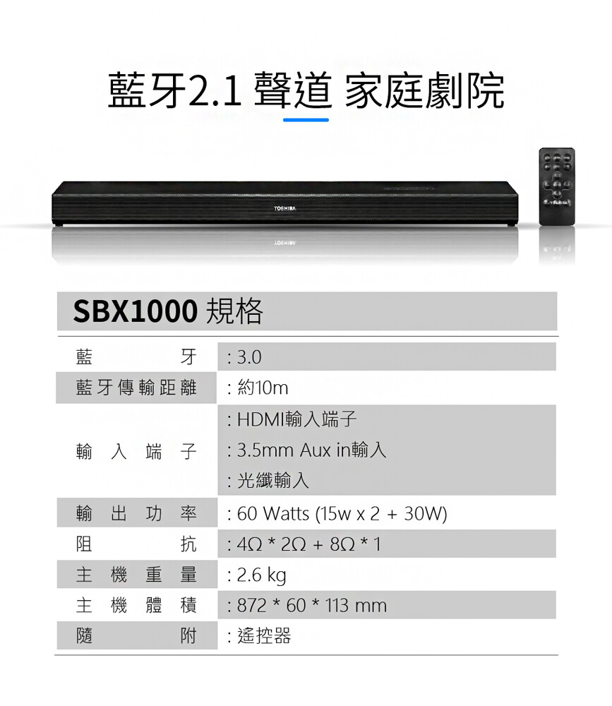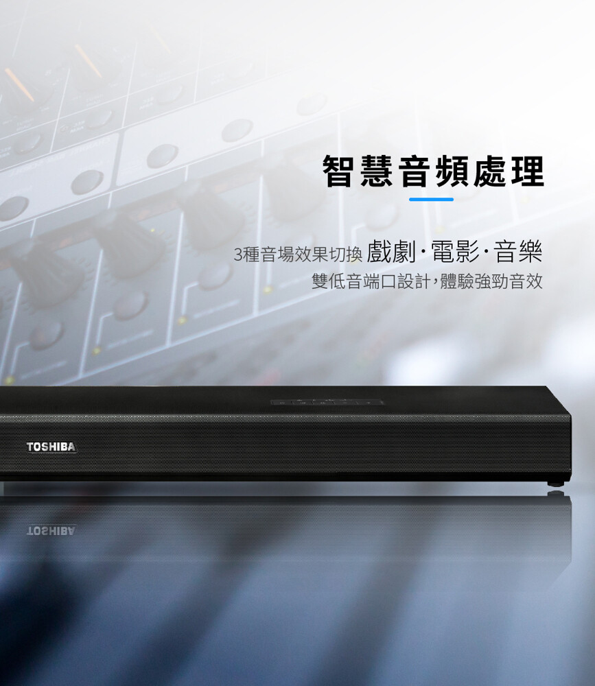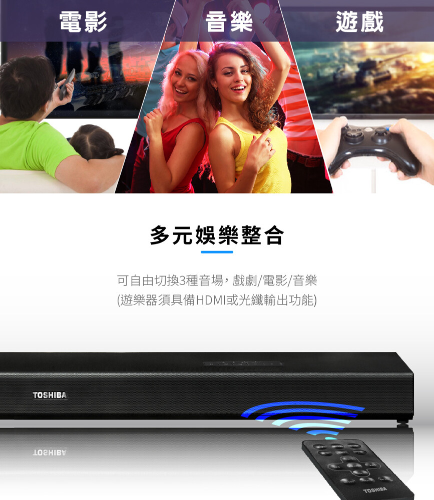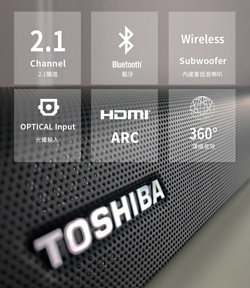 • TOSHIBA獨家環繞技術,提供360度全方位環繞音效,不須外接任何低音喇叭或是中高音揚聲器