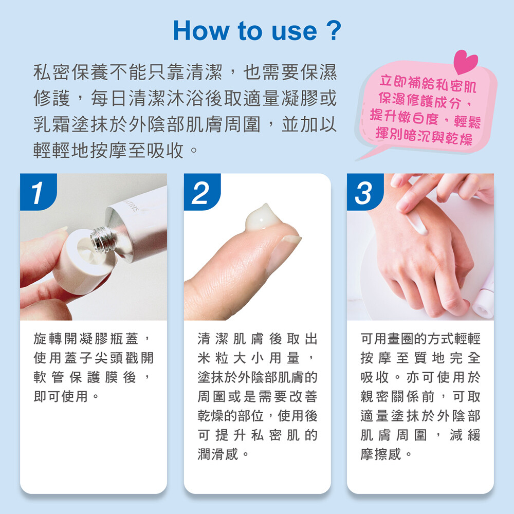 使用方法:清潔後建議搭配使用賽吉兒菁萃潔浴凝露,取米粒大小塗抹於外陰部肌膚周圍,並加以輕輕按摩至吸收;也可取適量塗抹於需要改善乾燥或促進潤滑感的肌膚。