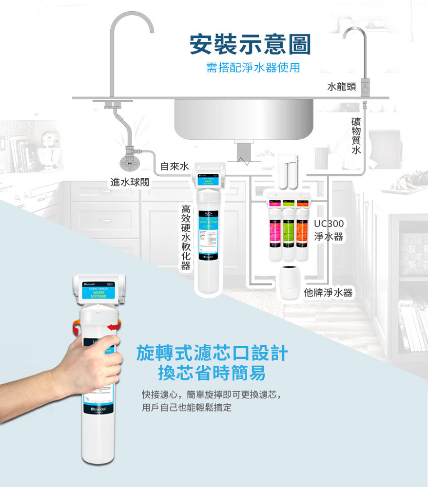 ❤ 高效硬水軟化交換功能,降低水中石灰質含量,使澀口的硬水轉換為甘甜軟水
