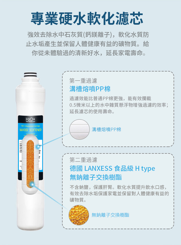 . 功效:強效去除水中石灰質(鈣鎂離子),軟化水質防止水垢產生、口感提升
