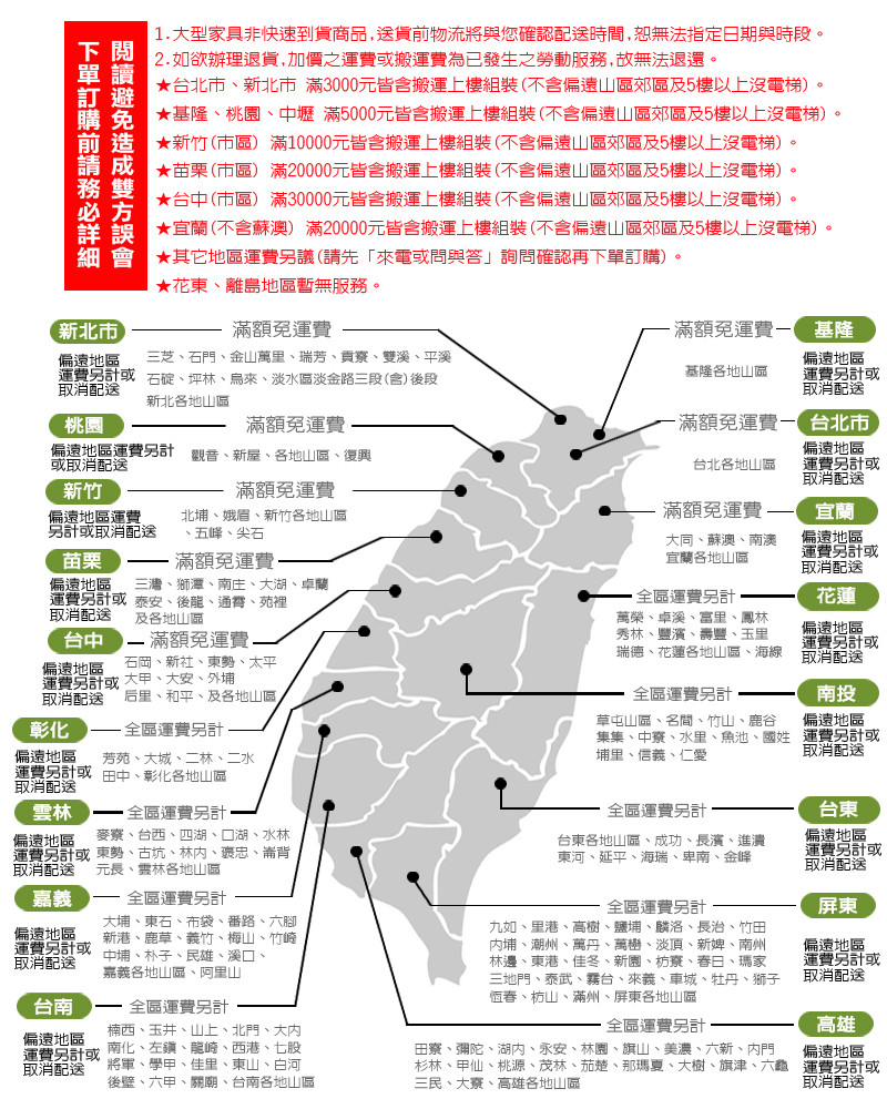 3. 商品配送日期時間若無法配合您希望到貨時段,需以本店安排車趟為主,如造成您的不便,敬請見諒。