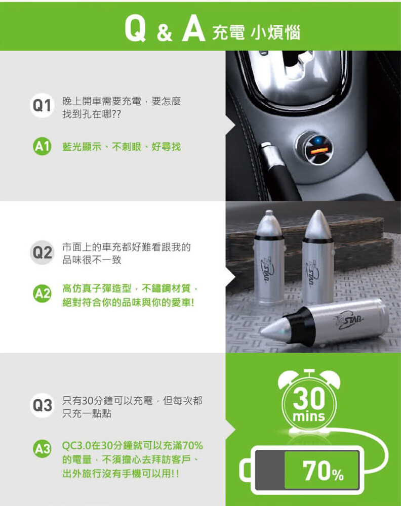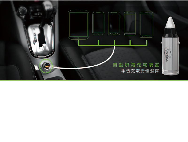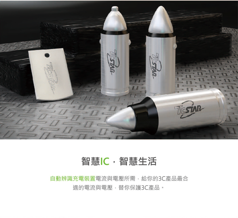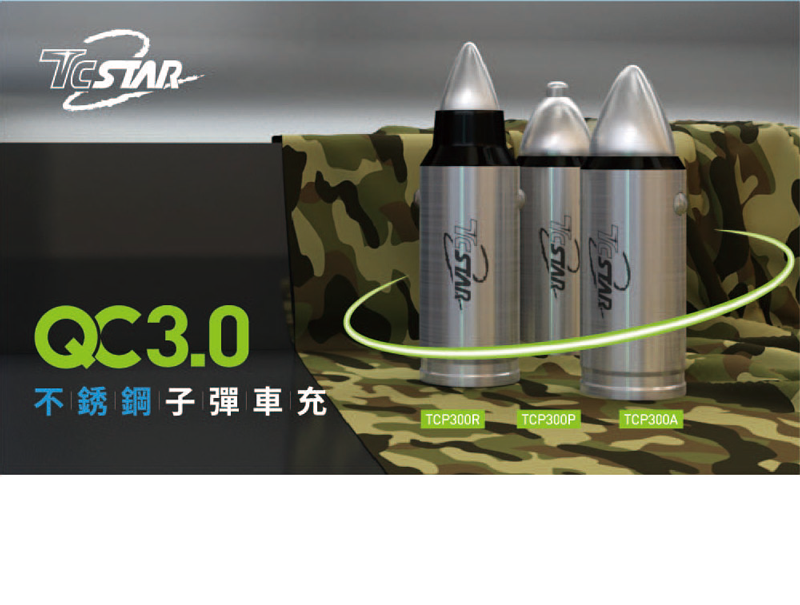 TCSTAR QC3.0快充不鏽鋼手槍彈造型車充(TCP300P)