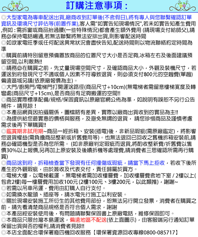 ◎大型家電為專車配送出貨,廠商收到訂單後(不含假日),將有專人與您聯繫確認訂單資訊及環境尺寸評估等(前置作業),客人需如實告知現場情況,若未如實告知產生費用,例如 : 需拆窗或商品抬過腰(一些特殊情況)都會產生額外費用 (請現場支付給師父),請務必保持電話暢通,若無法聯繫將無法安排出貨,則影響配送時間