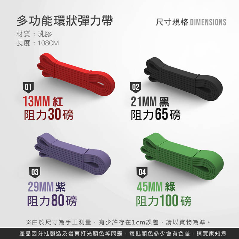 款式:紅色13mm-阻力30磅/黑色21mm-阻力65磅/紫色29mm-阻力80磅/綠色45mm-阻力100磅