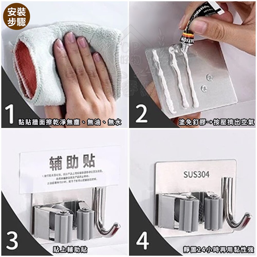 1.本商品內附黏膠,請黏貼24小時後再掛拖把等物品