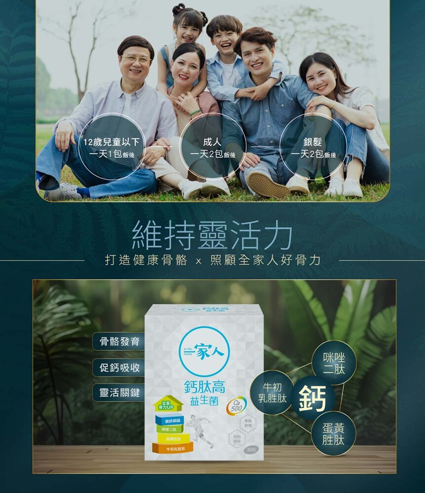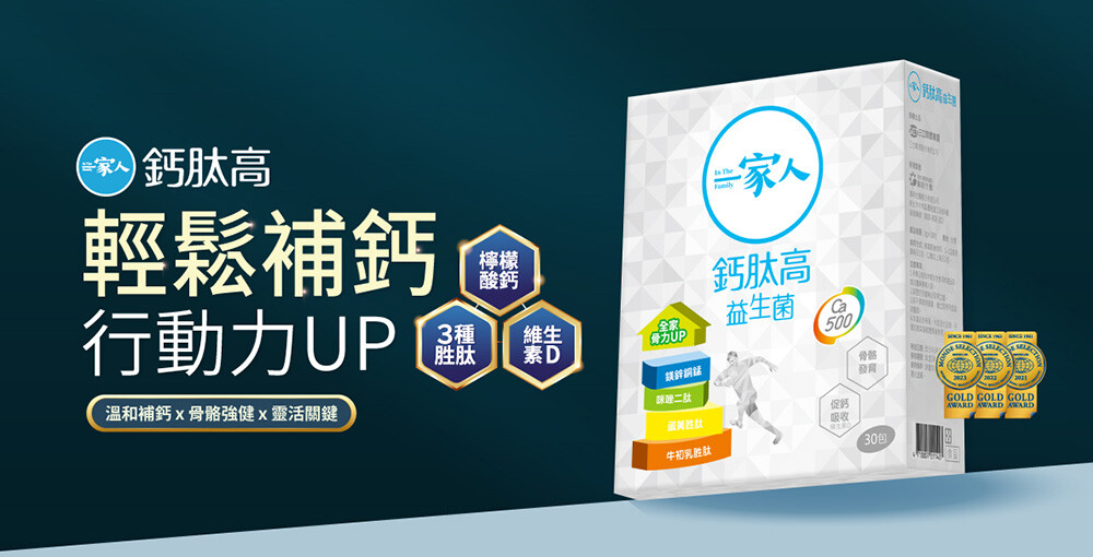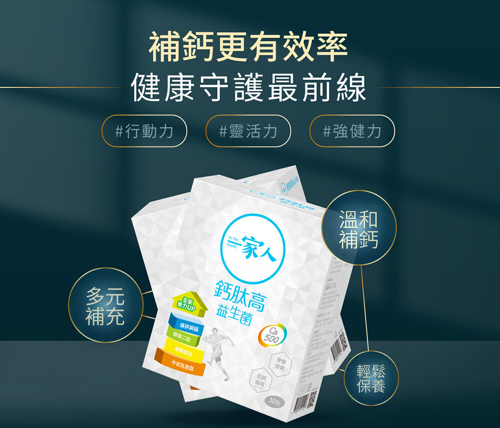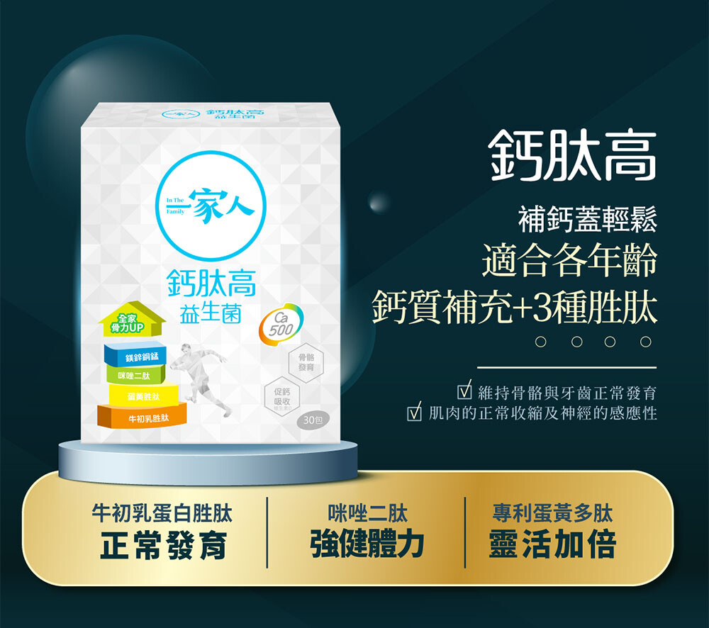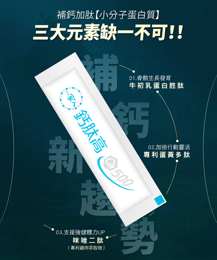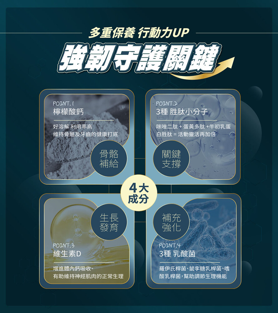 促鈣吸收500mg、三種有益菌株、三種特殊胜肽、六種黃金比例元素