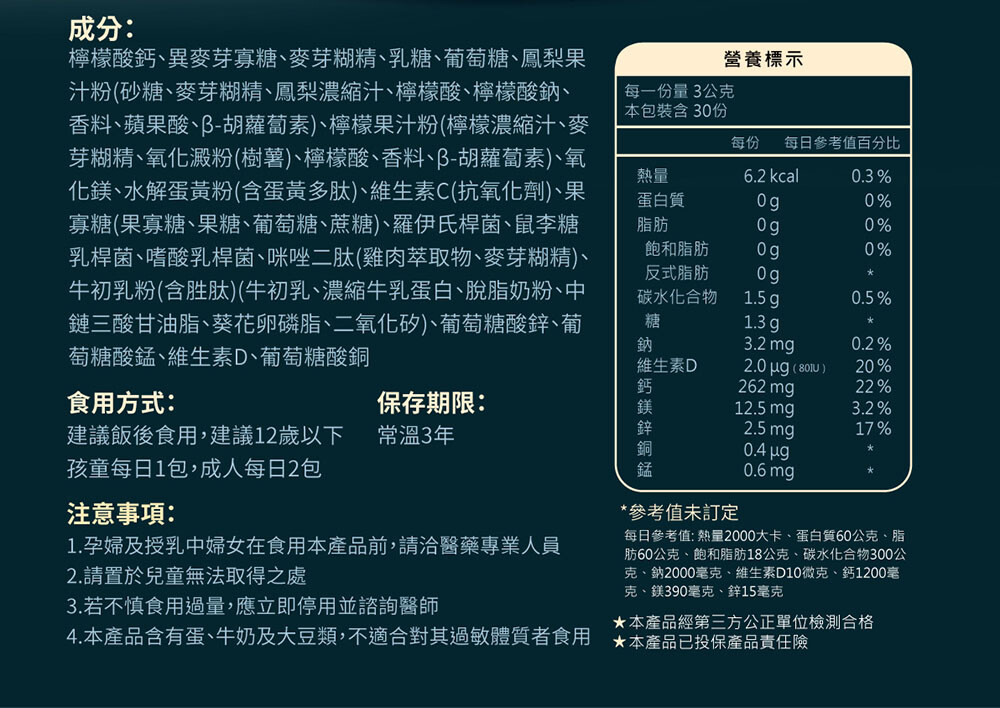 內 容 物:檸檬酸鈣、異麥芽寡糖、麥芽糊精、乳糖、葡萄糖、鳳梨果汁粉(砂糖、麥芽糊精、鳳梨濃縮汁、檸檬酸、檸檬酸鈉、香料、蘋果酸、β-胡蘿蔔素)、檸檬果汁粉(檸檬濃縮汁、麥芽糊精、氧化澱粉(樹薯)、檸檬酸、香料、β-胡蘿蔔素)、氧化鎂、水解蛋黃粉(含蛋黃多肽)、維生素C(抗氧化劑)、果寡糖(果寡糖、果糖、葡萄糖、蔗糖)、羅伊氏桿菌、鼠李糖乳桿菌、嗜酸乳桿菌、咪唑二肽(雞肉萃取物、麥芽糊精)、牛初乳粉(含胜肽)(牛初乳、濃縮牛乳蛋白、脫脂奶粉、中鏈三酸甘油脂、葵花卵磷脂、二氧化矽)、葡萄糖酸鋅、葡萄糖酸錳、維生素D、葡萄糖酸銅