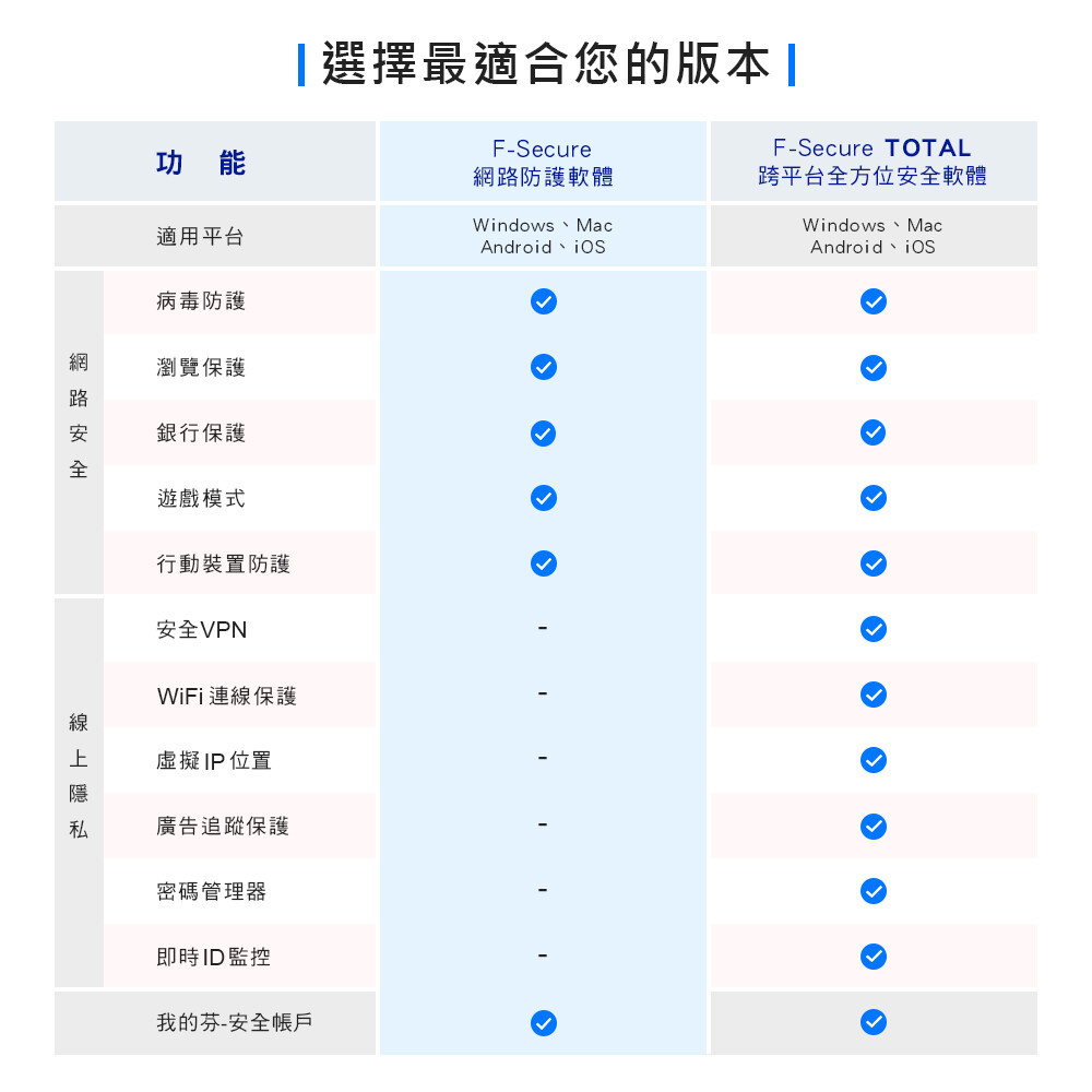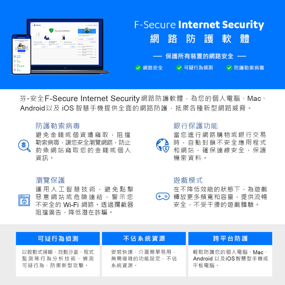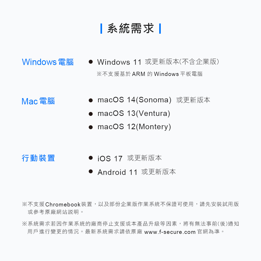 ※系統需求若因作業系統的廠商停止支援或本產品升級等因素,將有無法事前(後)通知用戶進行變更的情況。最新系統需求請依原廠www.f-secure.com官網為準。