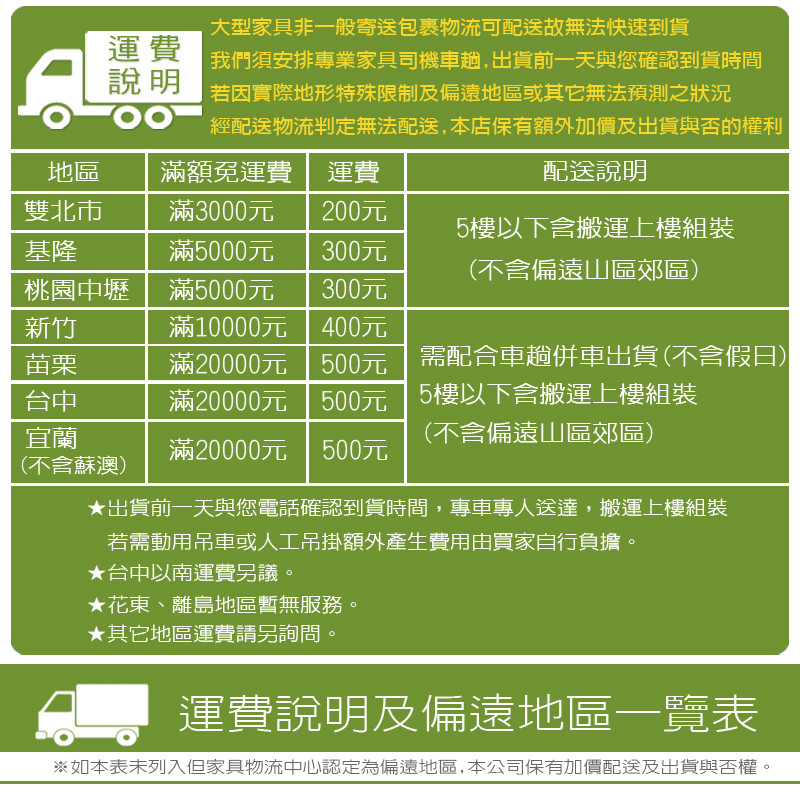 3. 商品配送日期時間若無法配合您希望到貨時段,需以本店安排車趟為主,如造成您的不便,敬請見諒。