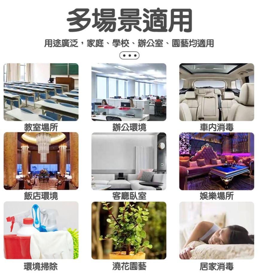 👍適用於教室場所、辦公環境、車內消毒、飯店環境、客廳臥室、營業場所、環境掃除、澆花園藝、居家消毒