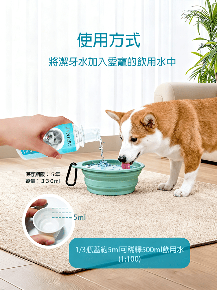 使用方式:將潔牙水直接添加到寵物飲用水碗中。