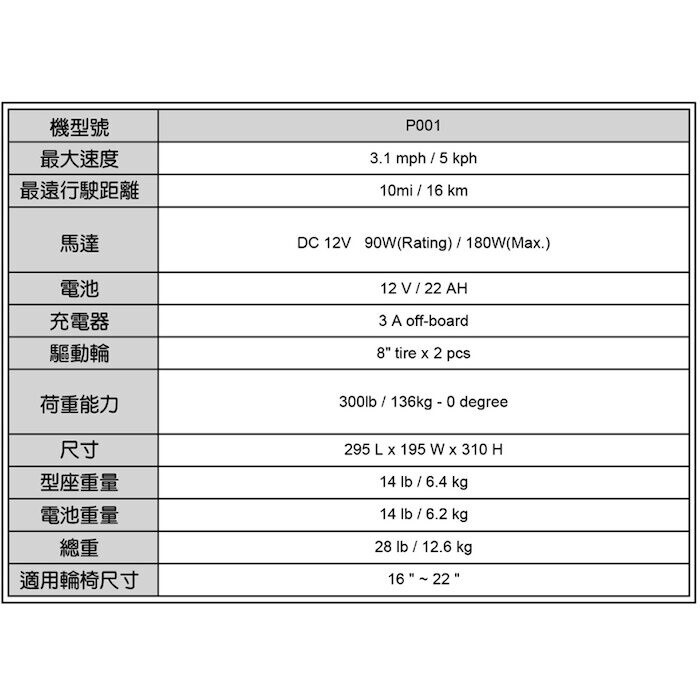 ◆ 本電動輔助式後輪,載重不可超過136公斤(不包含手動輪椅)。