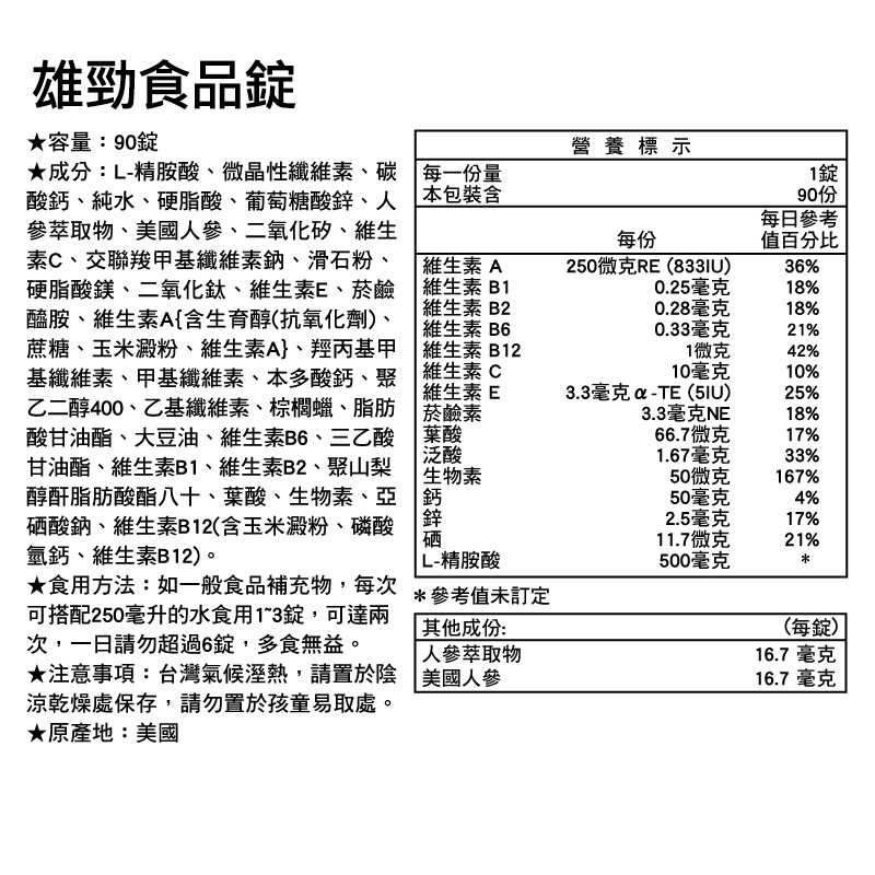成份: L-精胺酸、微晶性纖維素、碳酸鈣、純水、硬脂酸、葡萄糖酸鋅、人參萃取物、美國人參、二氧化矽、維生素C、交聯羧甲基纖維素鈉、滑石粉、硬脂酸鎂、二氧化鈦、維生素E、菸鹼醯胺、維生素A{含生育醇(抗氧化劑)、蔗糖、玉米澱粉、維生素A}、羥丙基甲基纖維素、甲基纖維素、本多酸鈣、聚乙二醇400、乙基纖維素、棕櫚蠟、脂肪酸甘油酯、大豆油、維生素B6、三乙酸甘油酯、維生素B1、維生素B2、聚山梨醇酐脂肪酸酯八十、葉酸、生物素、亞硒酸鈉、維生素B12(含玉米澱粉、磷酸氫鈣、維生素B12)。
