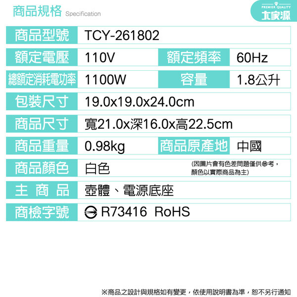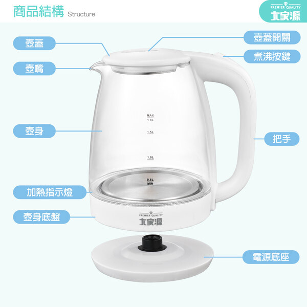 材質:內蓋、內蓋螺絲、加熱盤-304不鏽鋼、壺蓋、把手、壺身底蓋、電源底座-PP、壺身高硼矽玻璃