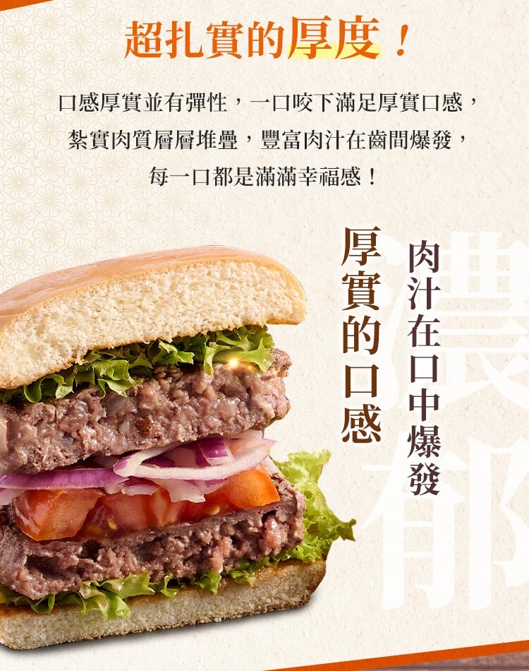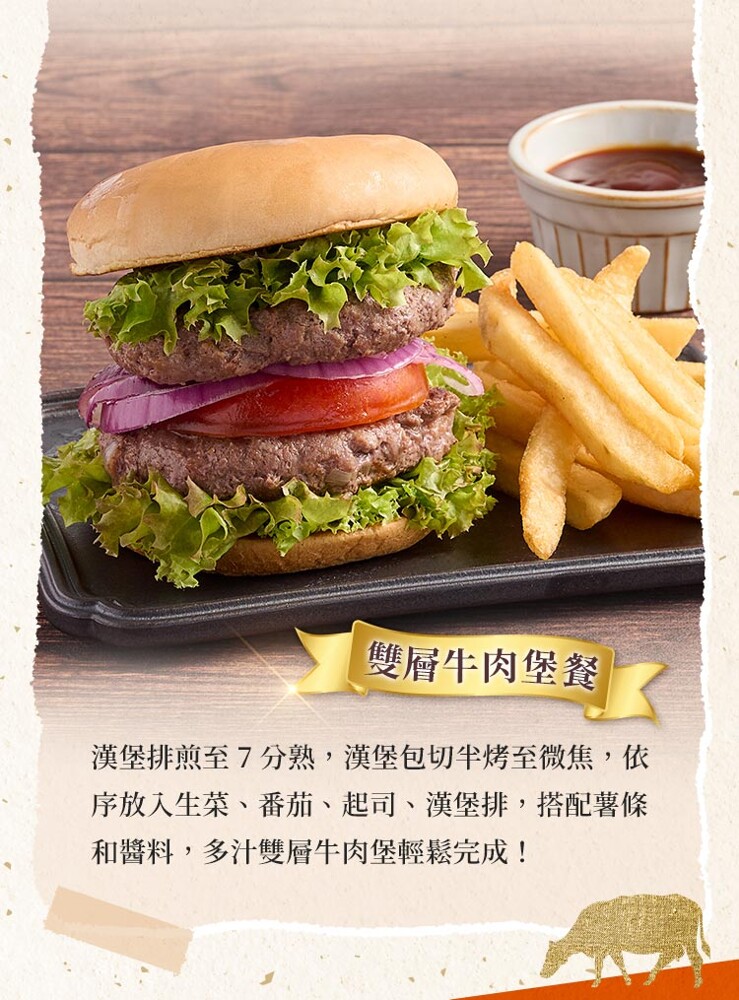 加熱調理條件:加入少許油並熱鍋,將解凍的漢堡排以中小火120度C煎四分鐘,換面一樣以中小火120度C煎四分鐘。