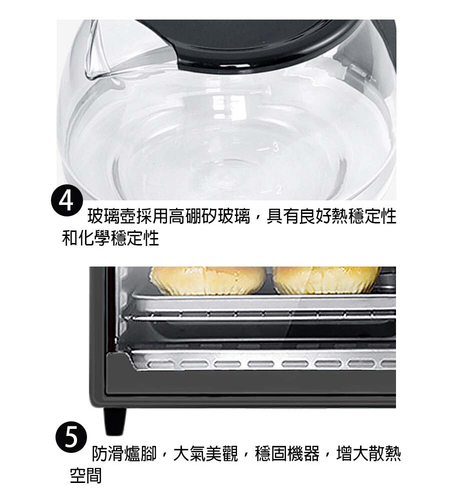 【配件】烤箱x1、不沾煎盤x1、玻璃煎盤蓋x1、烤架x1、烤盤x1、咖啡壺x1、咖啡濾網x1、說明書x1