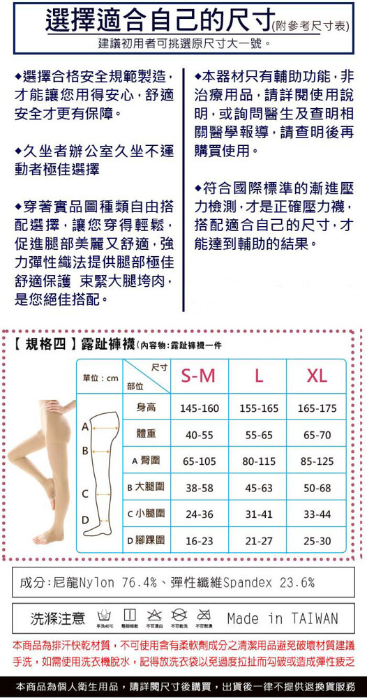 壓力:20-30mmHg輔助型褲襪,漸進壓力。