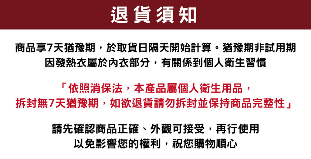 「依照消保法,本產品屬個人衛生用品,拆封無7天猶豫期,如欲退貨請勿拆封」