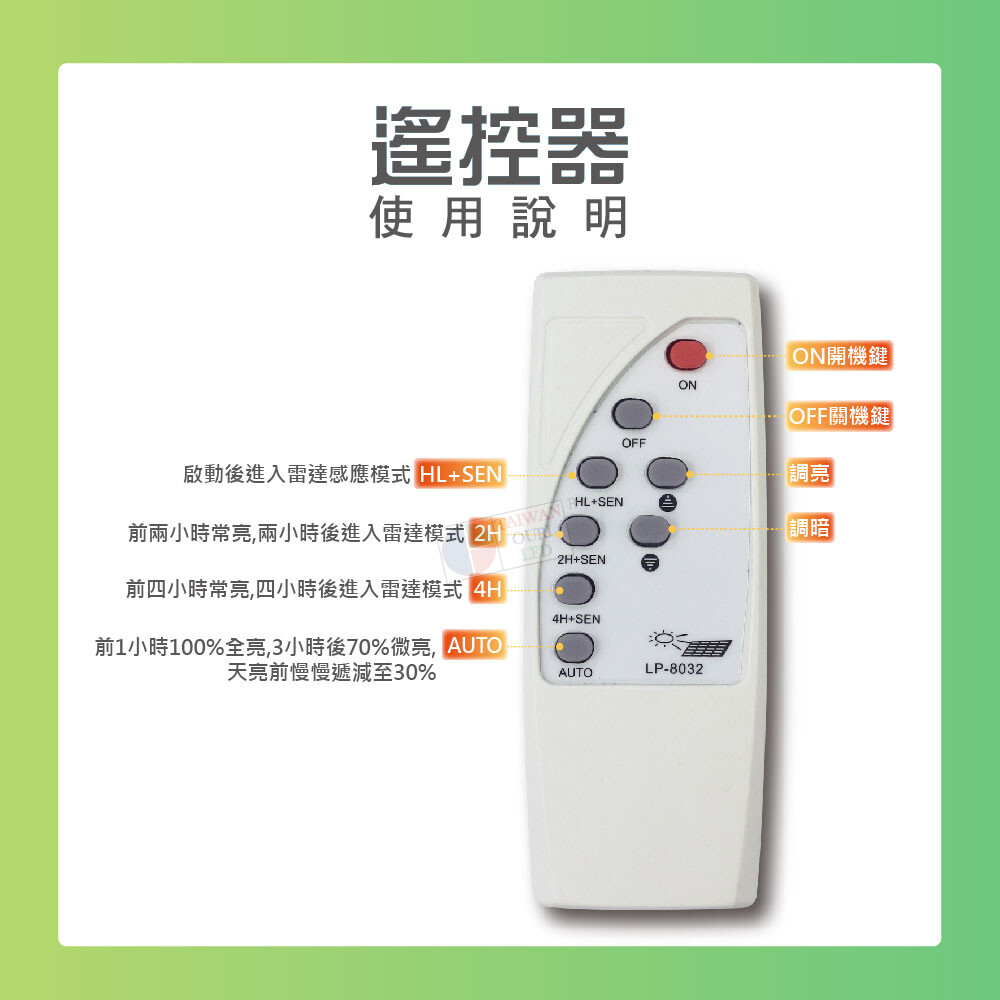 工作模式: 光控、雷達感應、遙控器、天黑亮天亮關