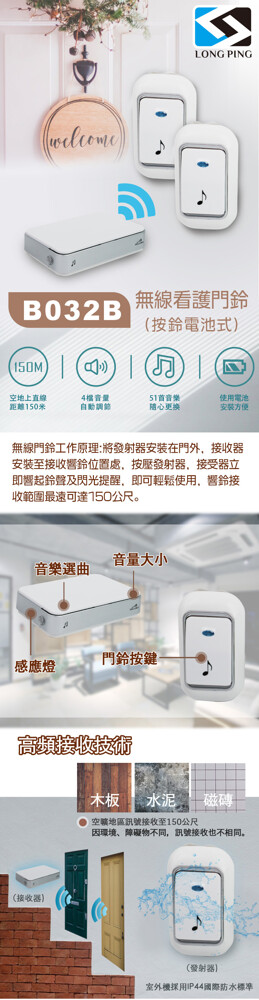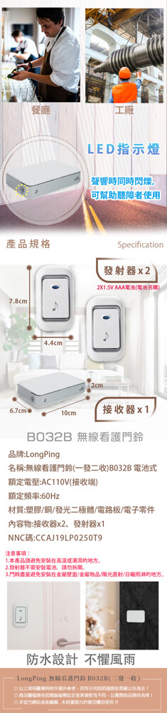 LongPing 無線看護門鈴(二發一收) B032B 電池式(公司貨)