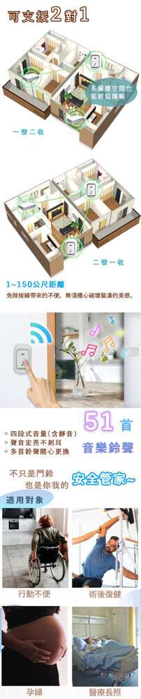 名稱:無線看護門鈴(二發一收) B032B 電池式