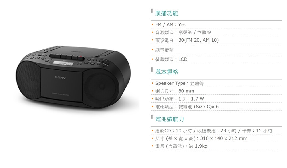 播放CD:10 小時 / 收聽廣播:23 小時 / 卡帶:15 小時