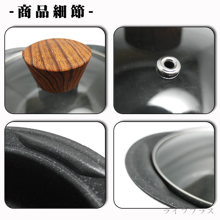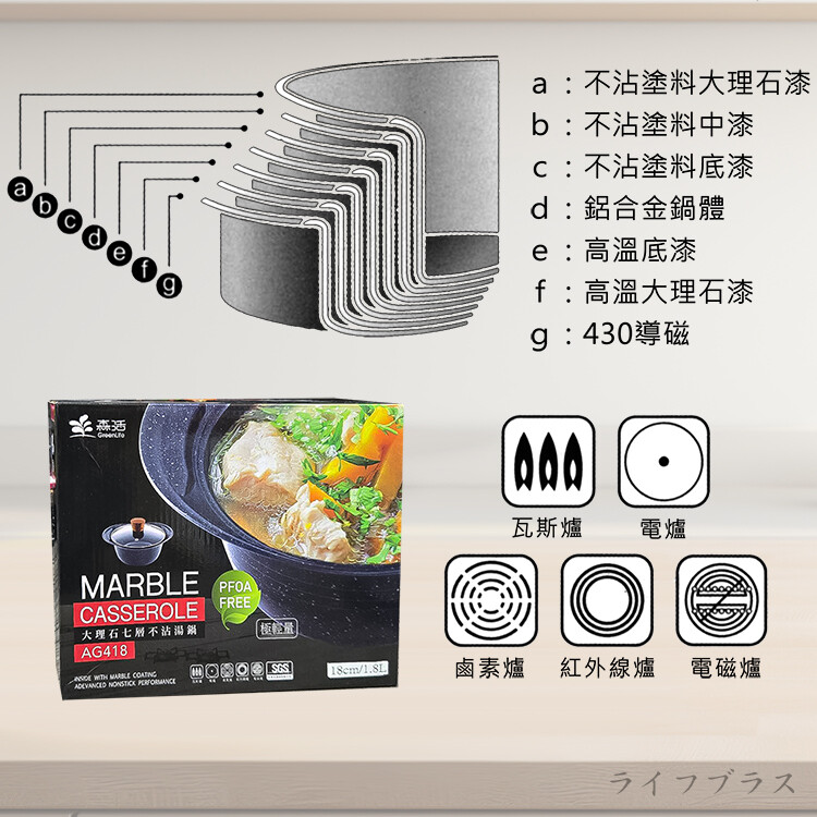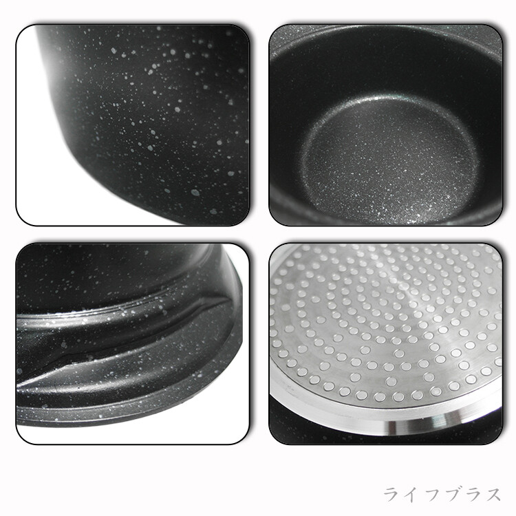 通過SGS材質檢驗標準,使用安心,採用日本okitsumo塗層,大理石不沾塗層,不留食物殘味,傳熱快速,極輕量七層導熱更均勻,儲熱性佳,料理食物好鍋具,瓦斯爐、電爐、鹵素爐、紅外線爐通通適用,IH電磁爐對應設計。