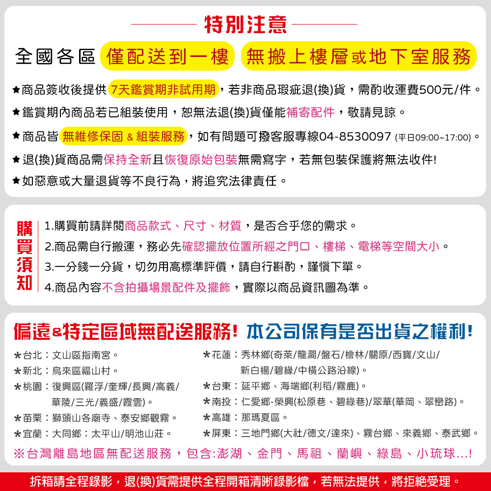 4.商品組裝前請確認零件有無瑕疵缺件。商品如經拆封、組裝、使用、拆解以致缺乏完整性及失去再販售價值時,恕無法退(換)貨!