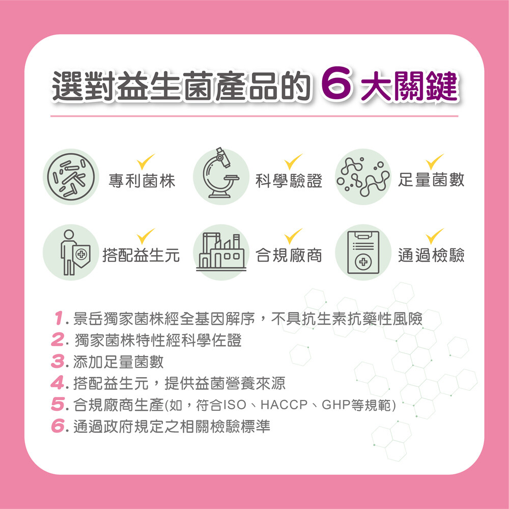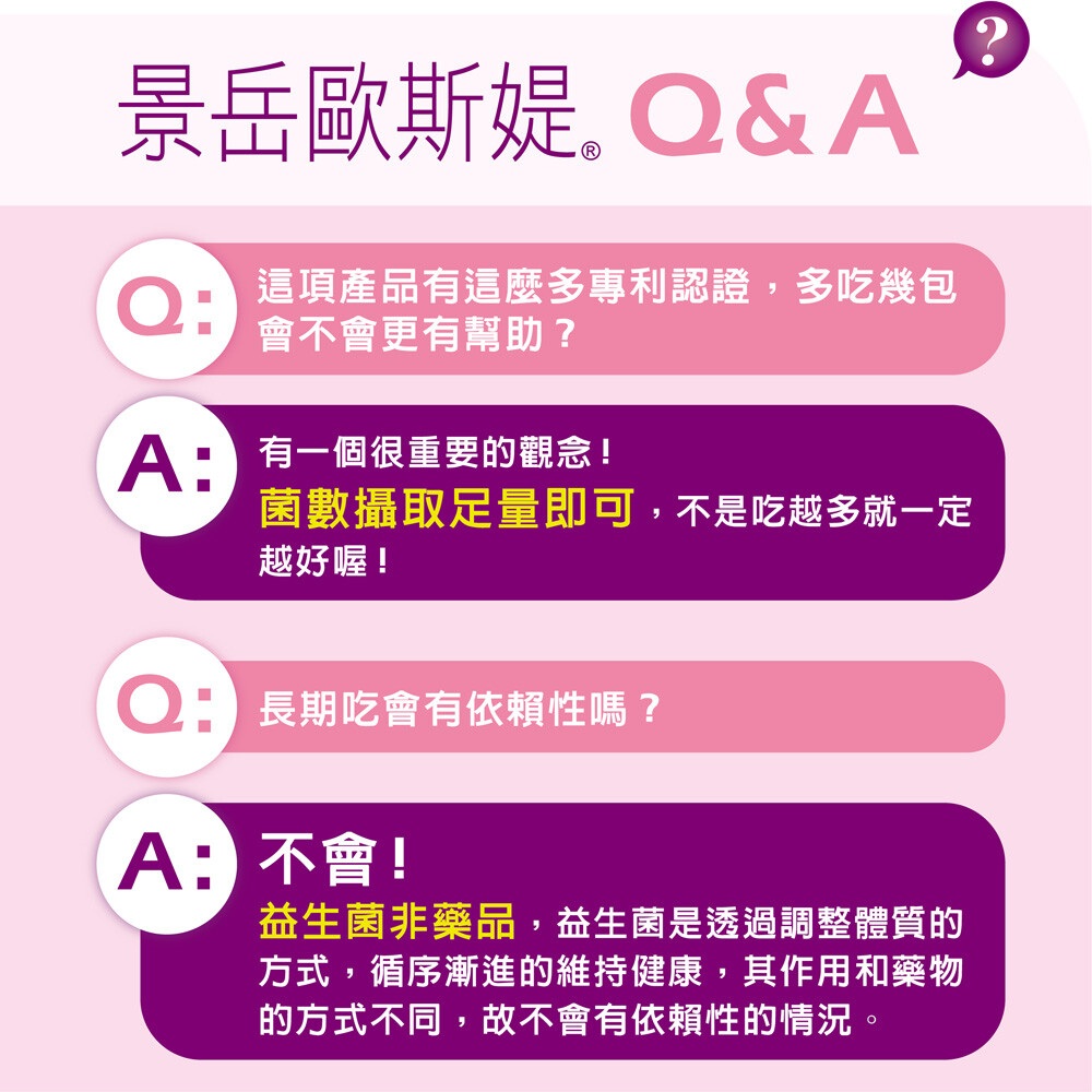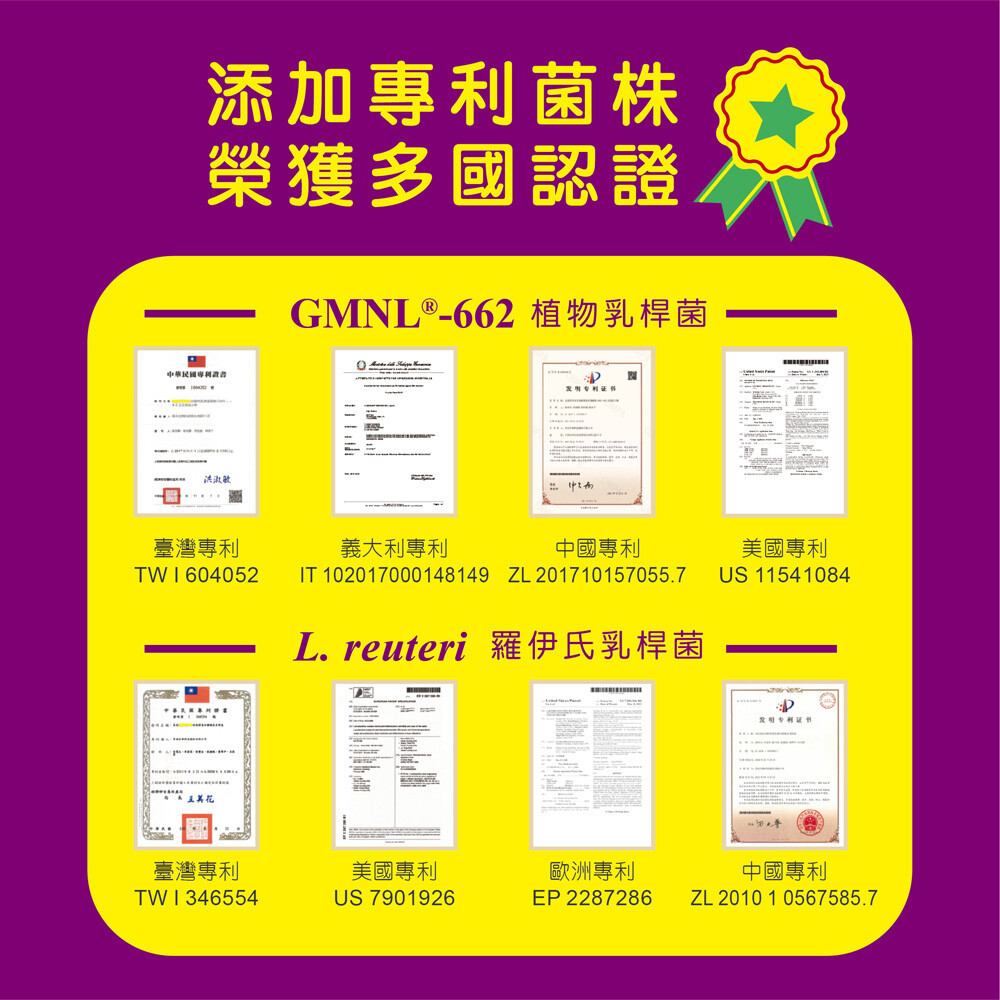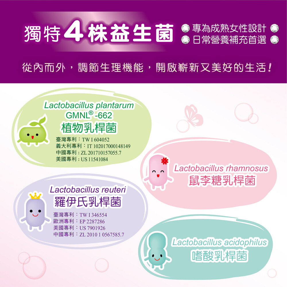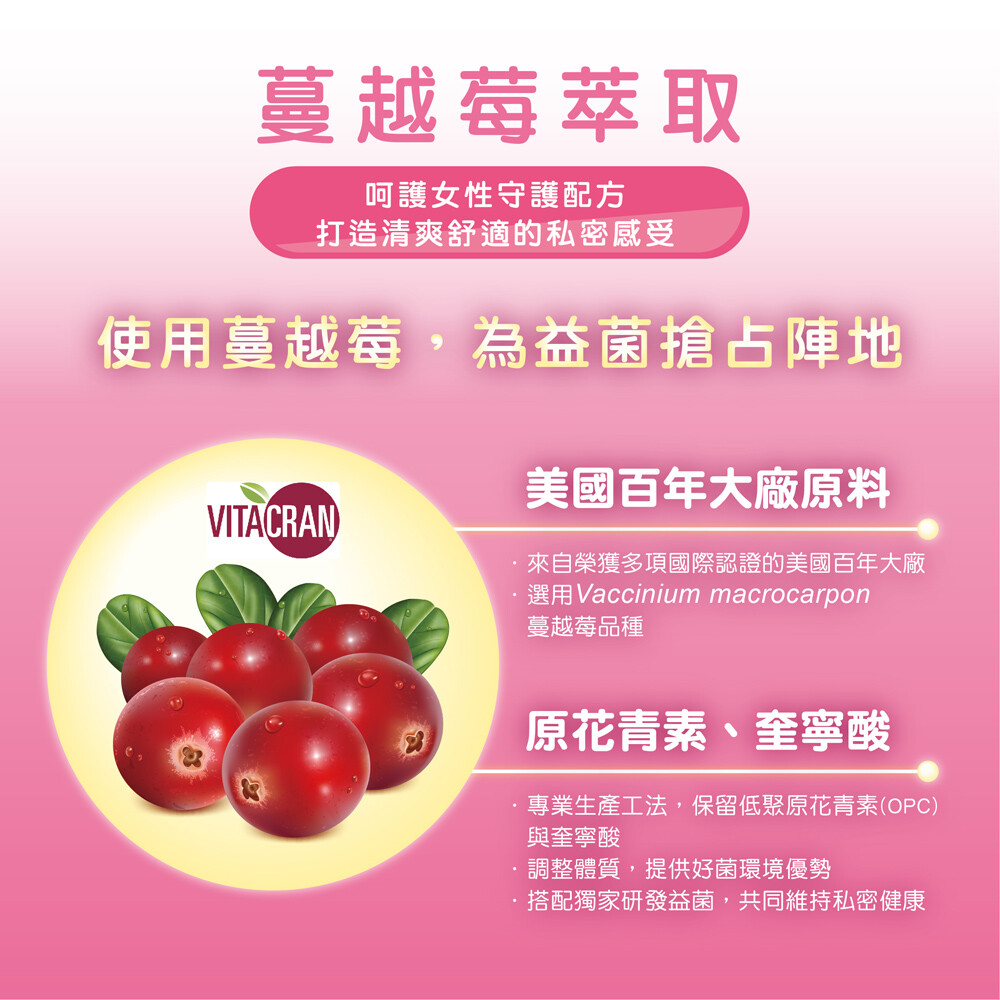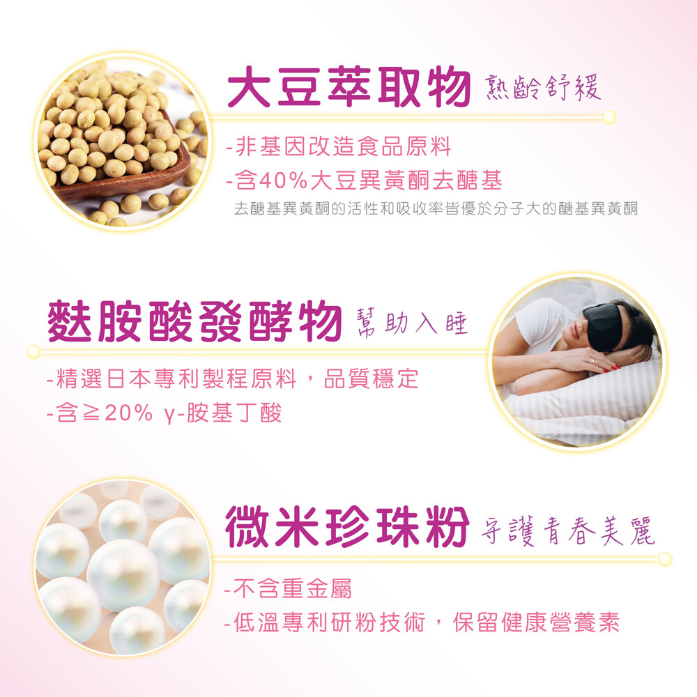 【成分】玉米來源可溶性纖維、果寡糖、葡萄糖、玉米澱粉、蔓越莓果汁粉{砂糖、蔓越莓果汁粉(麥芽糊精、蔓越莓濃縮汁、葡萄汁色素、辛烯基丁二酸鈉澱粉、黑加侖濃縮汁)、辛烯基丁二酸鈉澱粉、檸檬酸、檸檬酸鈉、玉米澱粉、蘋果酸、蔓越莓香料粉(辛烯基丁二酸鈉澱粉、麥芽糊精、蔓越莓香料、脂肪酸甘油酯、維生素E(抗氧化劑))、β-胡蘿蔔素(麥芽糊精、阿拉伯膠、中鏈三酸甘油酯、蔗糖、L-抗壞血酸鈉(抗氧化劑)、β-胡蘿蔔素、二氧化矽、生育醇(維生素E)(抗氧化劑))、胭脂紅}、微米珍珠粉、蔓越莓粉(蔓越莓萃取粉、麥芽糊精、玉米澱粉、卵磷脂)、植物乳桿菌GMNL®-662、鼠李糖乳桿菌、麩胺酸發酵物(含γ-胺基丁酸)(氧化澱粉、麩胺酸發酵物)、麥芽糊精、大豆萃取物(含異黃酮40%)、脂肪酸蔗糖酯、二氧化矽、嗜酸乳桿菌、羅伊氏乳桿菌。