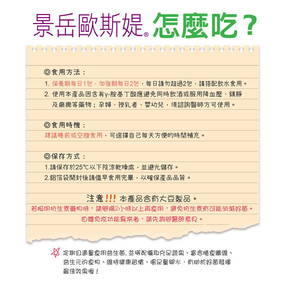 2. 使用本產品因含有γ-胺基丁酸應避免同時飲酒或服用降血壓、鎮靜及癲癇等藥物;孕婦、授乳者、嬰幼兒,須諮詢醫師方可使用。
