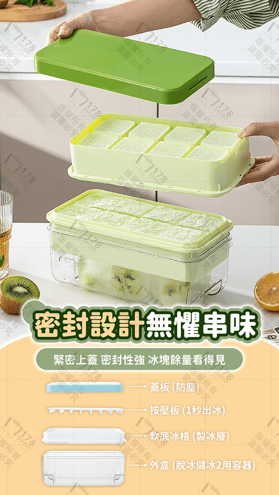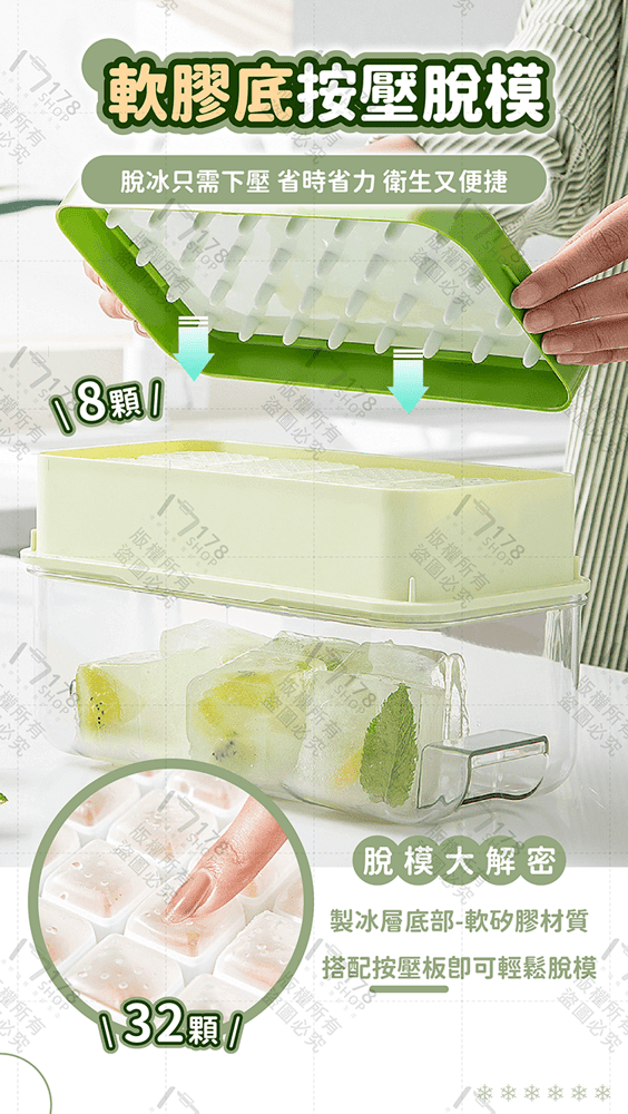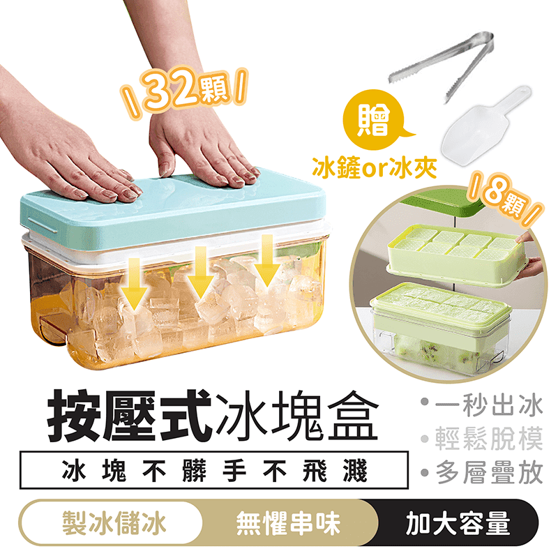 32顆套組-送冰鏟:蓋板X1、按壓板X1、32格軟底冰格X1、儲冰盒X1、冰鏟X1