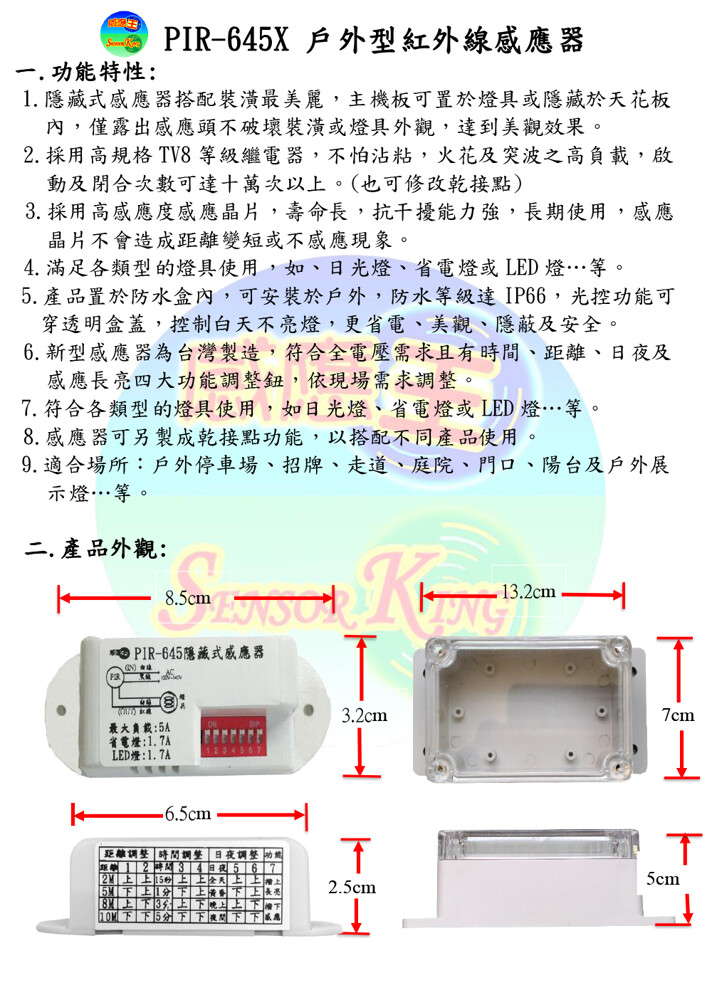 6.新型感應器為台灣製造,符合全電壓需求且有時間、距離、日夜及感應長亮四大功能調整鈕,依現場需求