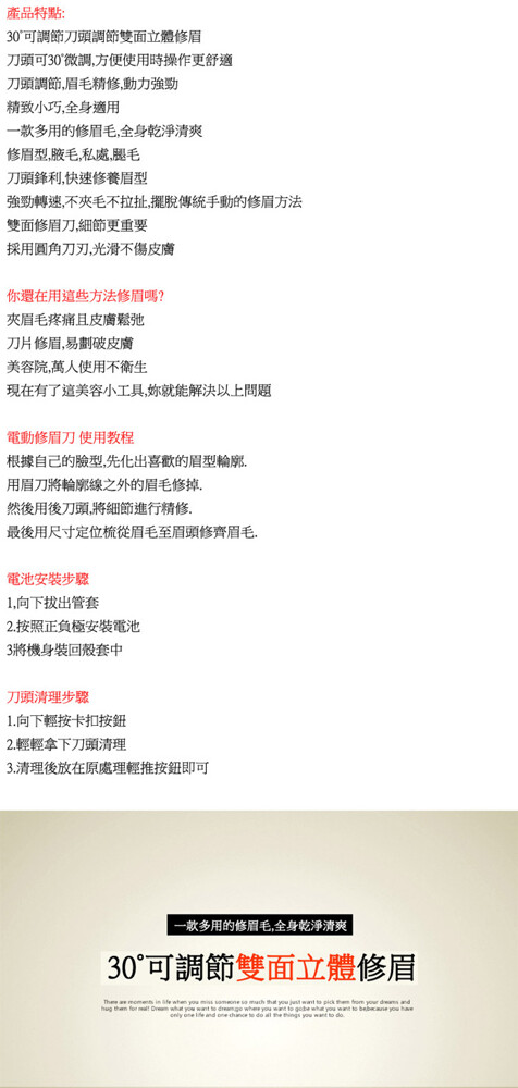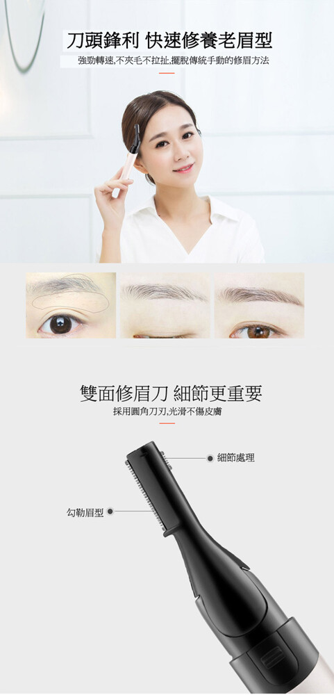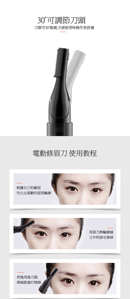 產品特點: 30°可微調節刀頭,調節雙面立體修眉,方便使用操作更舒適 刀頭調節,眉毛精修,動力強勁,精致小巧,全身適用 修眉型,腋毛,私處,腿毛,刀頭鋒利,快速修養眉型 強勁轉速,不夾毛不拉扯,採用圓角刀刃,光滑不傷皮膚