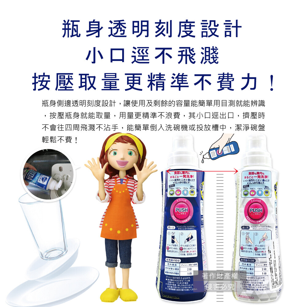 (2)用拇指於瓶身PUSH處按壓,將所需用量倒入洗碗機或投放槽中。