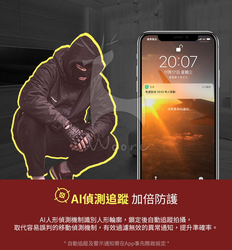 。AI識別✨人形輪廓,鎖定後自動追蹤拍攝,取代容易誤判的移動偵測機制,有效過濾無效的異常通知,提升準確率。