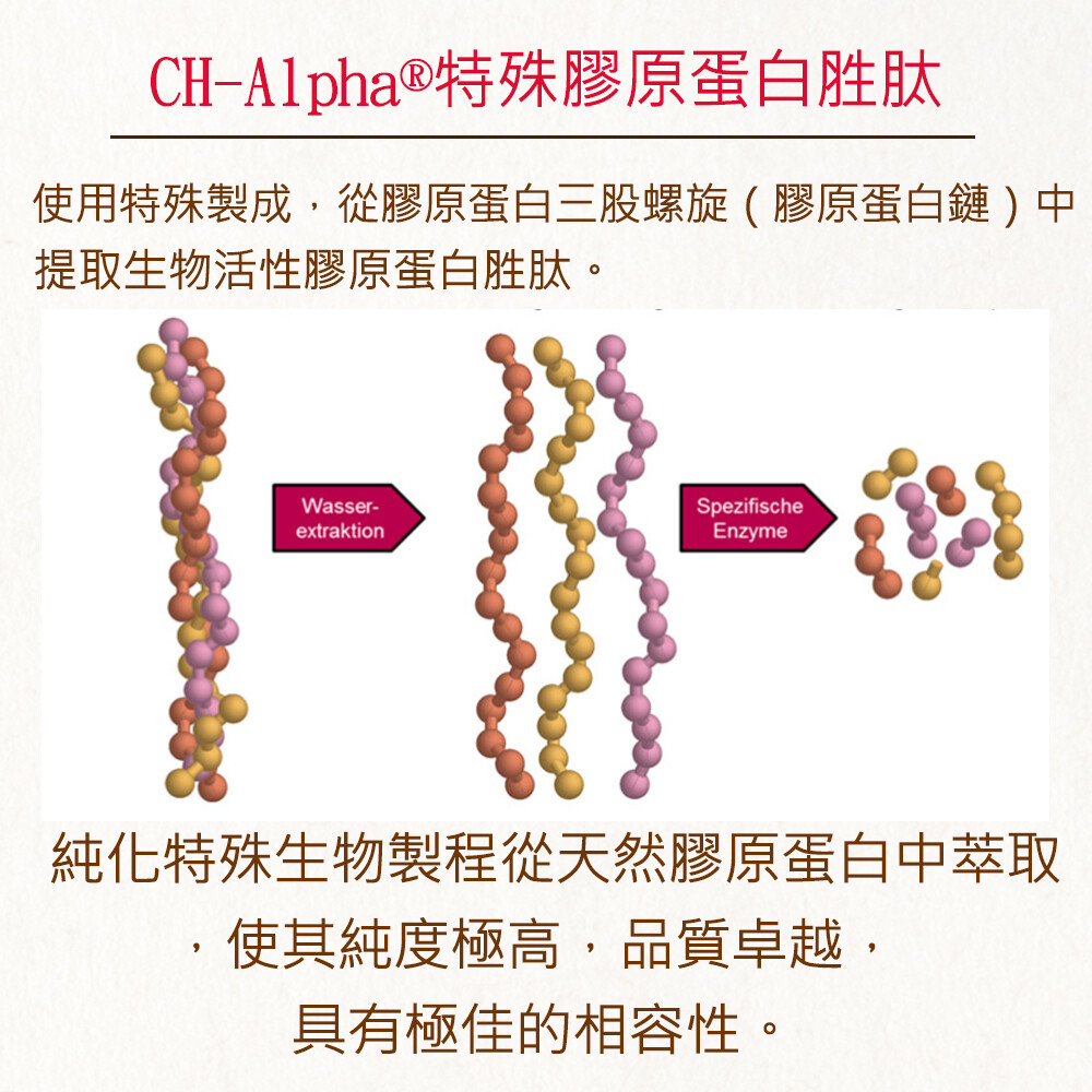 CH-Alpha®Plus含有膠原蛋白胜肽特殊品質的CH-Alpha®,這意味著所含的營養物質特別容易被身體有效吸收高品質膠原蛋白肽