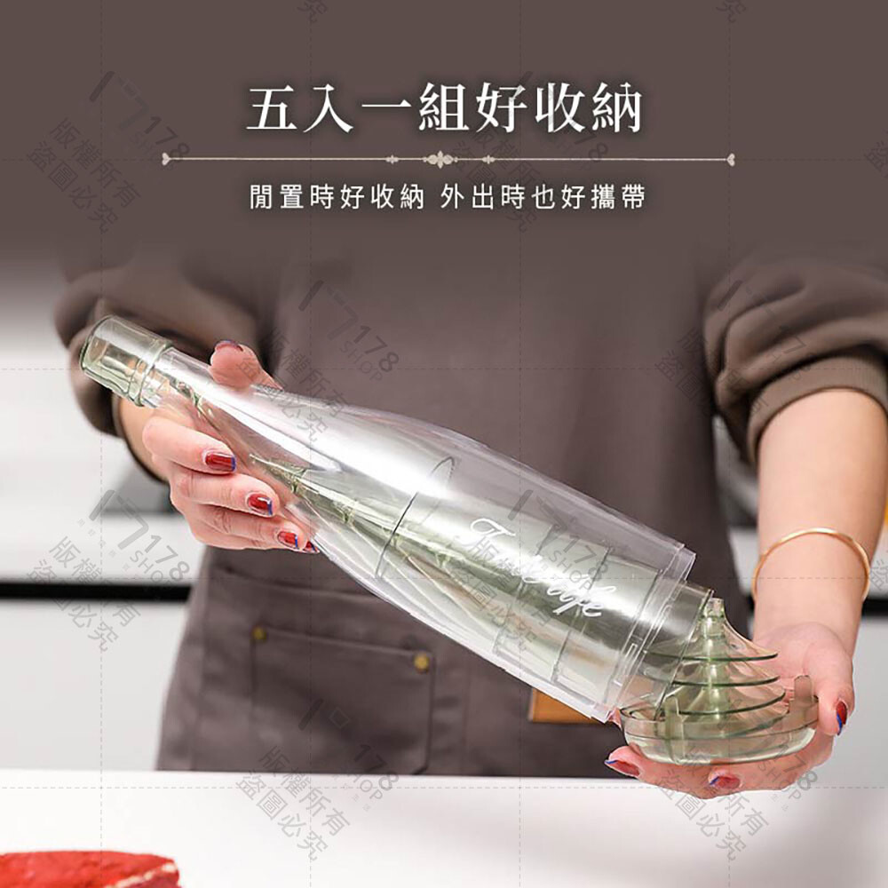 內容物:香檳杯 ×5(含底座)、香檳瓶造型收納筒 ×1