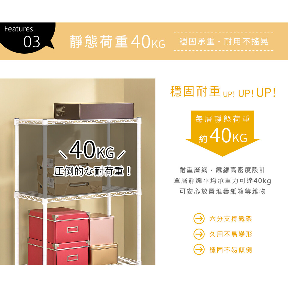 ✓ 耐重層網,單層靜態平均荷重可達40kg,安心放置、穩固耐用。