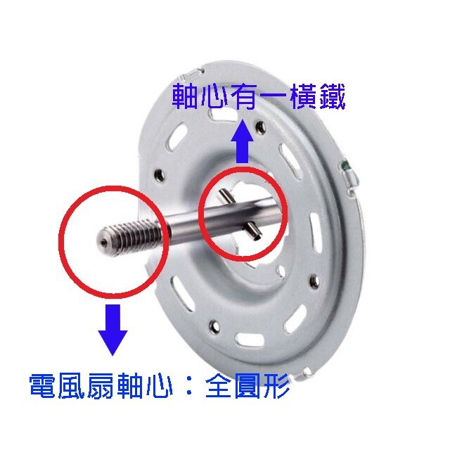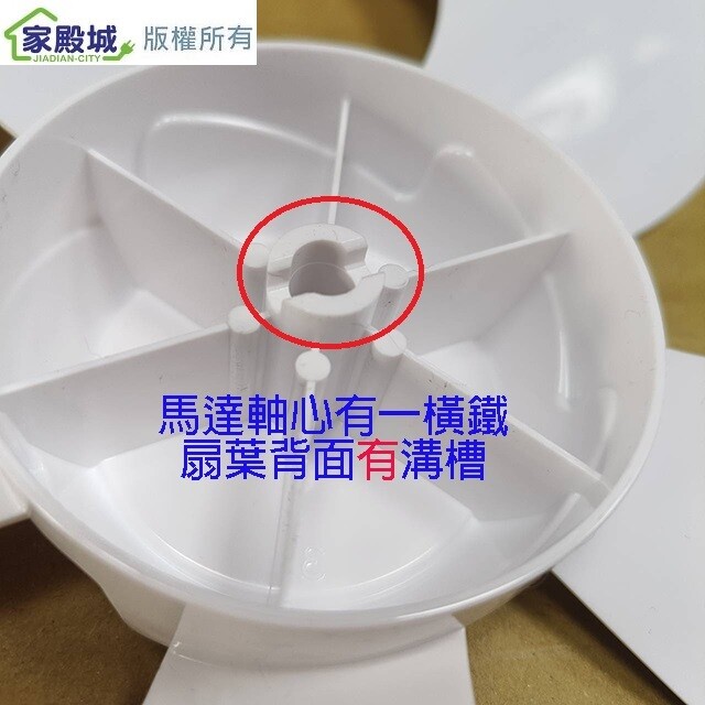 ❁中間軸心全圓,馬達軸心有一橫鐵,扇葉背面有溝槽