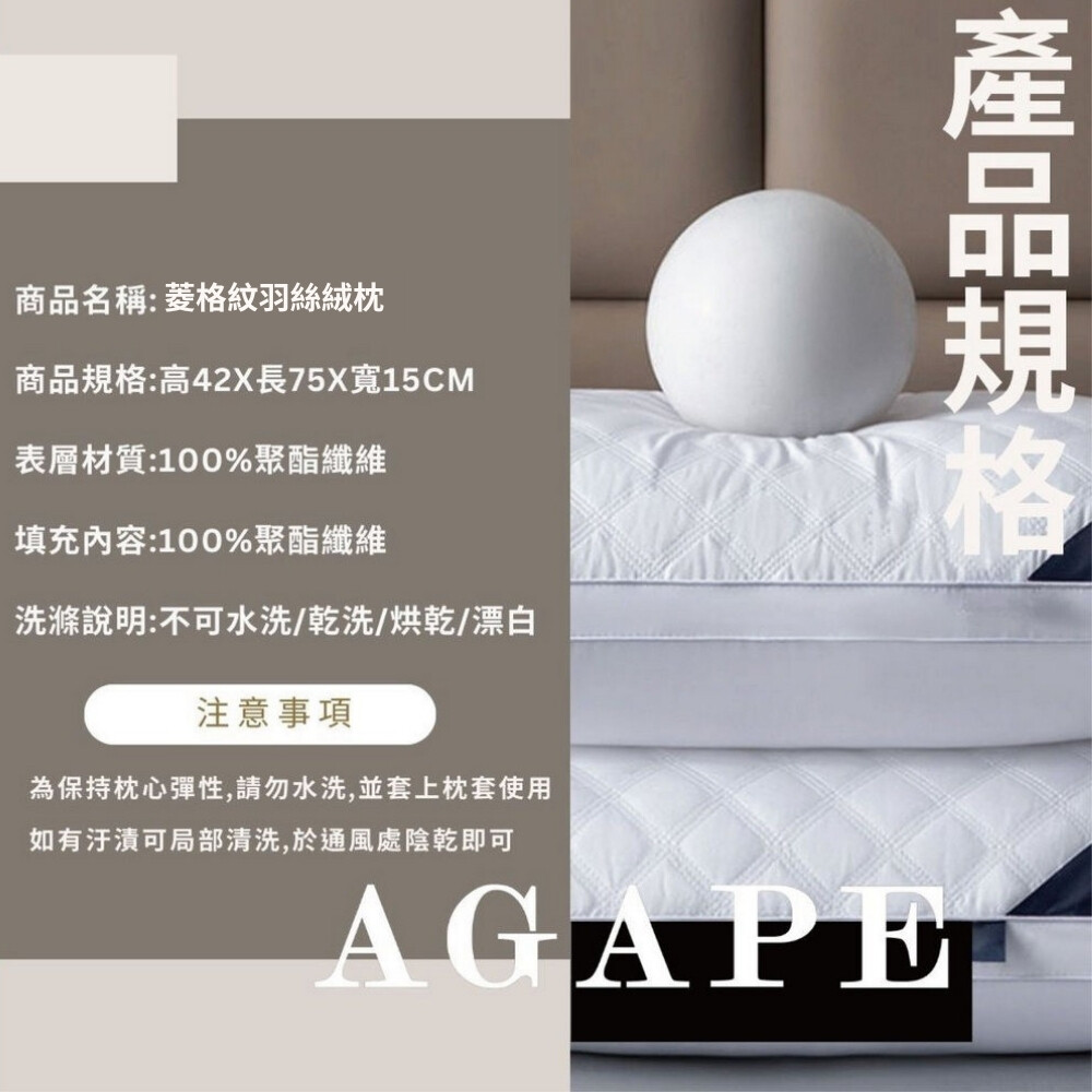 品名:七星級飯店菱格紋 尺寸:42x75(cm)。(真空包裝壓縮) 材質:100%聚酯纖維 表布:100%聚酯纖維 由於枕頭為真空包裝壓縮, 請打開後需持續拍打、左右上下拉扯 至膨鬆為止,枕頭才會蓬起來。